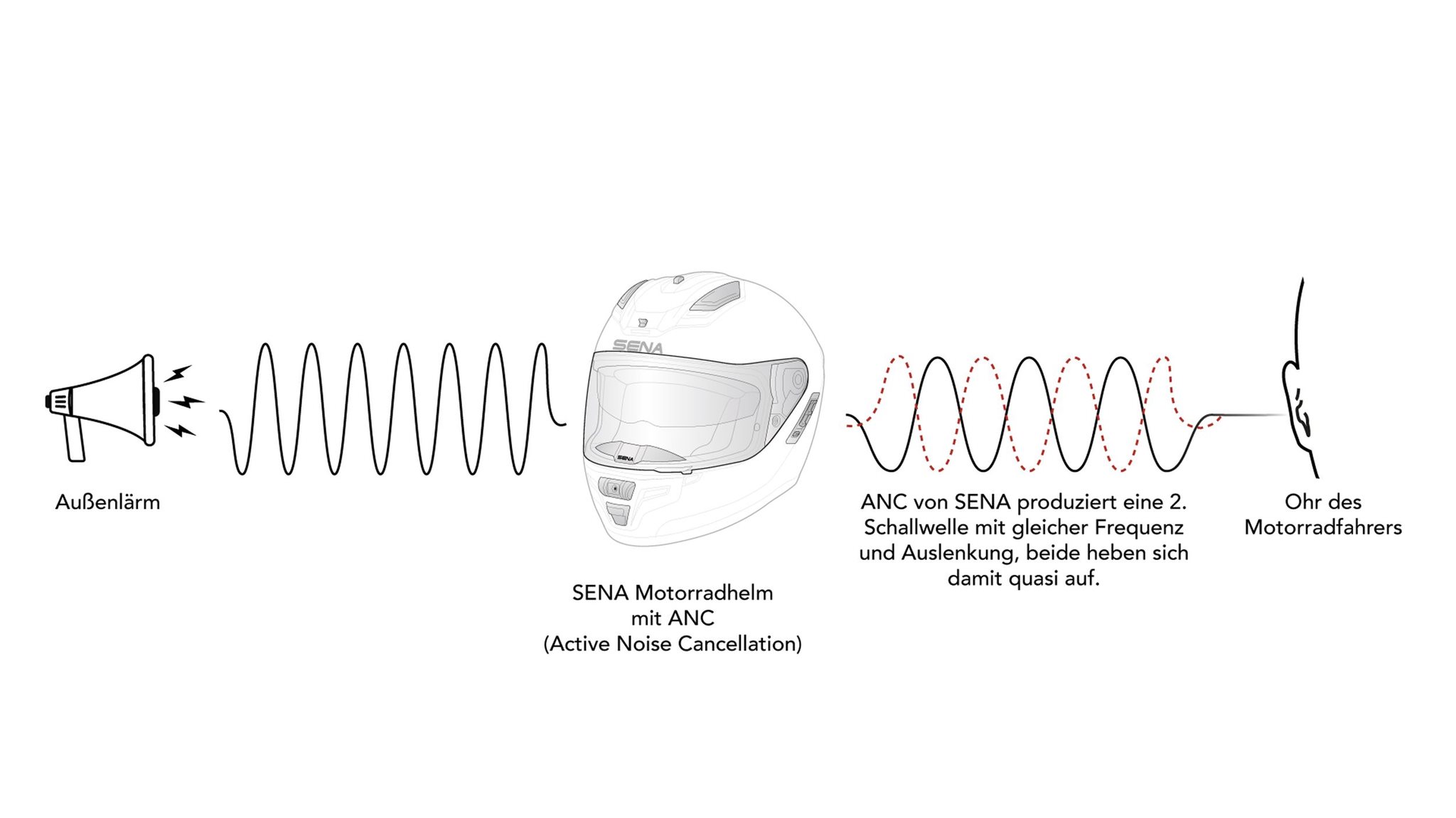 Genau hier setzt Active Noise Cancellation (ANC) an. Was in Flugzeugen oder Kopfhörern längst Standard ist, soll laut SENA künftig auch im Motorradhelm funktionieren.