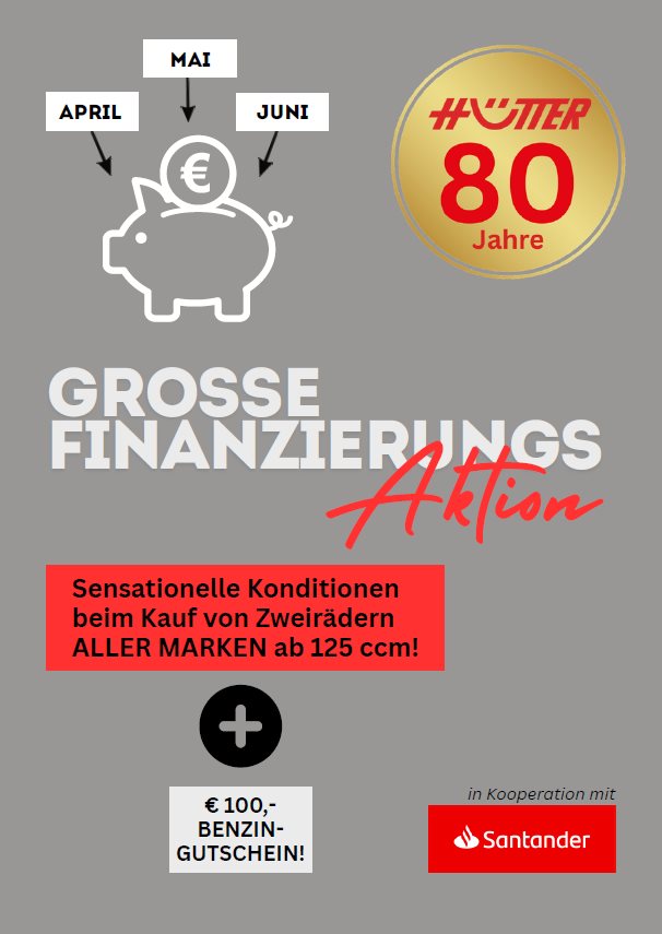 Und Du kannst sogar noch weitersparen: im April, Mai & auch im Juni bekommst Du TOP Konditionen bei Finanzierung mit der Santanderbank sowie einen Tankgutschein im Wert von € 100,- beim Kauf eines Fahrzeuges ab 125ccm.