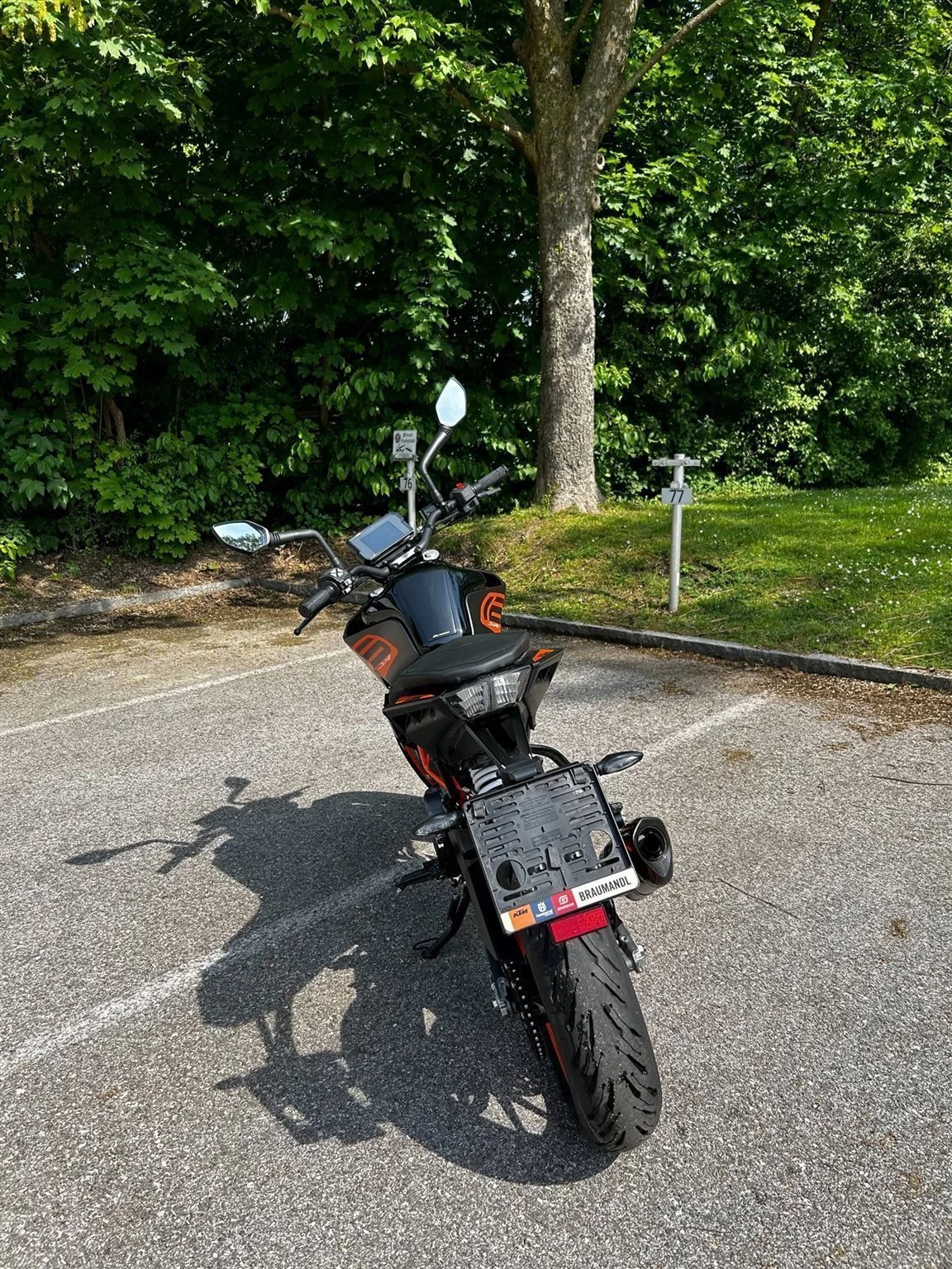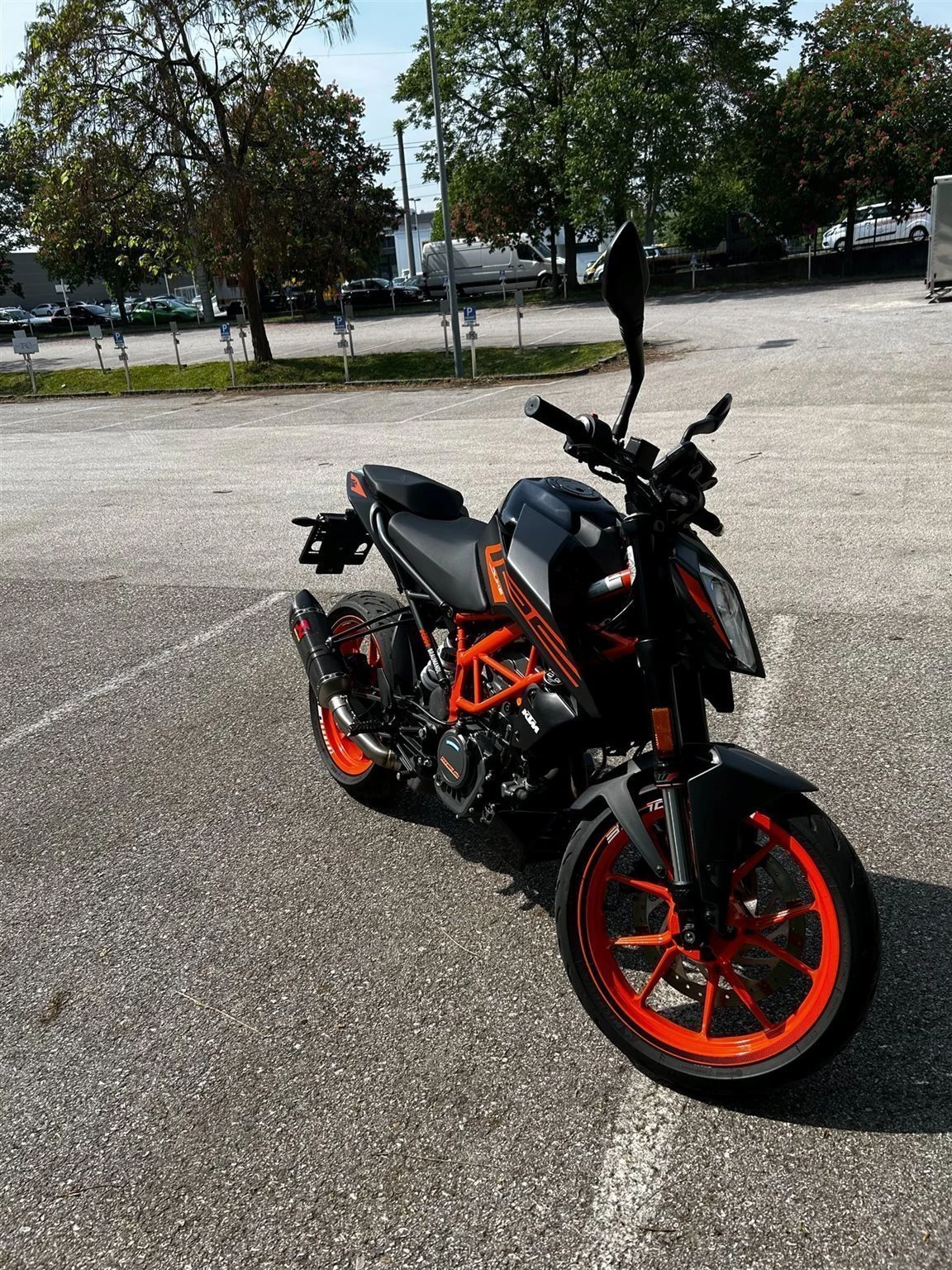 Extras: Akrapovic Slipon Duke Auspuffanlage, Enddämpferhalterung, Felgenaufkleber, Kennzeichenhalterung schwarz, Tankpad schwarz, Schalthebel schwarz, Displayschutzfolie transparent