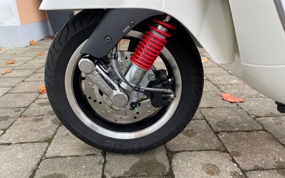 Optisch präsentiert sich die GTS 125 in sehr gutem Zustand: Die Lackierung glänzt und weist nur minimale Gebrauchsspuren auf, die bei einem Fahrzeug dieses Alters normal sind. Der Rahmen ist rostfrei, und die Reifen befinden sich in gutem Zustand. Die Sitzbank bietet hohen Komfort und ist ebenfalls in sehr gutem Zustand, ohne Risse oder nennenswerte Abnutzung.