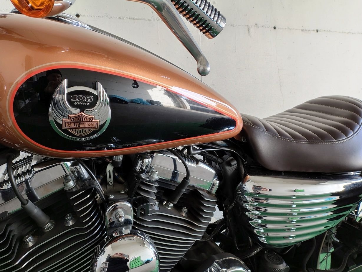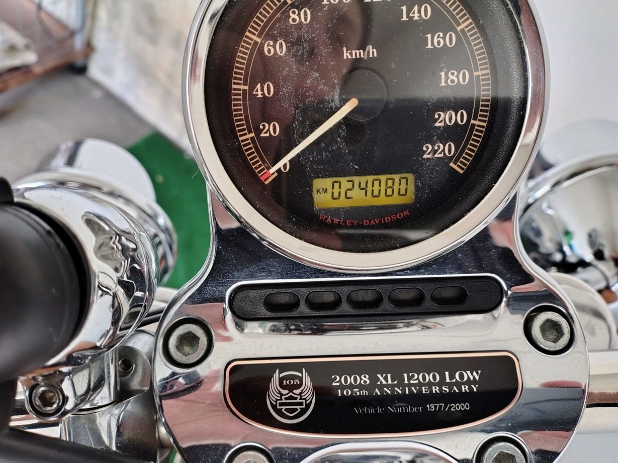 Harley Davidson Sportster XL-1200-L Jahr 2008, 105. Jubiläum. Das Motorrad hat nichts mehr mit dem Original zu tun (Foto 01). Tune-up-Arbeiten wurden jedes Jahr durchgeführt. Motorrad immer gewartet, Original-Kilometerstand 24.000, mit eigenem Wartungsbuch und Papieren.