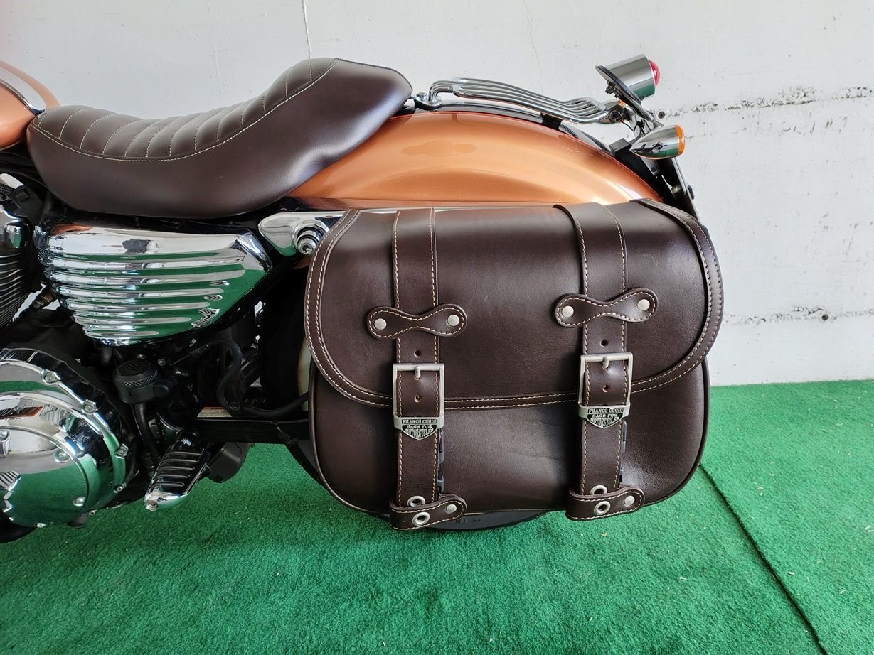 - Zwei Packtaschen (rechts und links) aus echtem Leder, die bei der Handwerksfirma 'Franco Cuoio' gekauft und mit einem harten Rücken und verchromten Befestigungen in Schnellwechsel-Taschen (Click & Clack) umgewandelt wurden. Sie können nach Belieben an- und abmontiert werden.