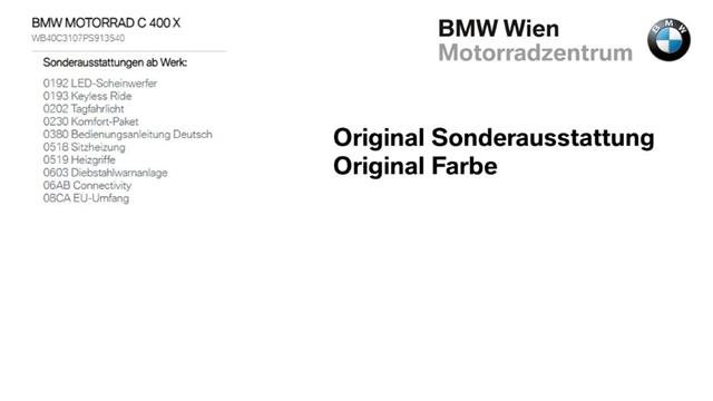 Fahrgestellnr: S913540#VZM#Heizgriffe, Warnblinkanlage, Windschild Eine schoene C400 X inkl. Sonderausstattungen ab Werk siehe Bild 8 steht zum Verkauf., Gerne bieten wir auch eine entsprechende Finanzierung, Versicherung mit und ohne Kasko oder die Zustellung des Bikes nach Ihren Wuenschen an.S913540, Sie koennen mich auch direkt kontaktieren : Christian Maurer 0676 888 755 224 oder christian.cm.maurer@bmw-wien.at,
