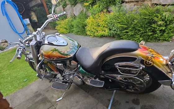 Mit schönen Airbrush Einzelstück lackierung sehr auffällig wenn man unterwegs damit ist.sehr verlässlich hat mich in den vielen jahren nie um stich gelassen.Extras.