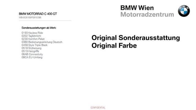 Fahrgestellnr: S910386Sitzheizung, Heizgriffe, Windschild, Keyless Ride Eine schoene C400 GT inkl. Sonderausstattungen ab Werk siehe Bild 11 steht zum Verkauf., Gerne bieten wir auch eine entsprechende Finanzierung, Versicherung mit und ohne Kasko oder die Zustellung des Bikes nach Ihren Wuenschen an.S910386, Sie koennen mich auch direkt kontaktieren : Christian Maurer 0676 888 755 224 oder christian.cm.maurer@bmw-wien.at,