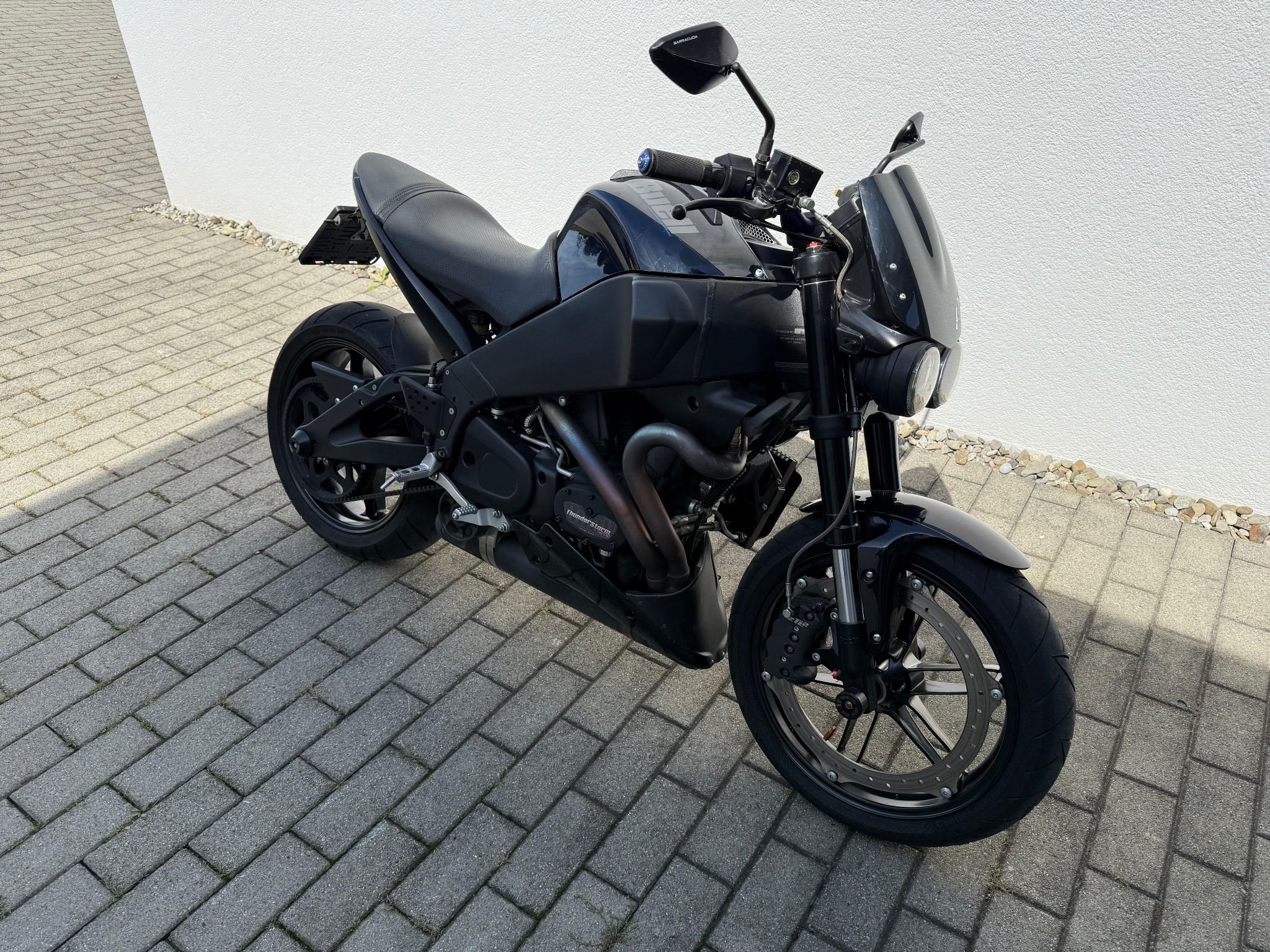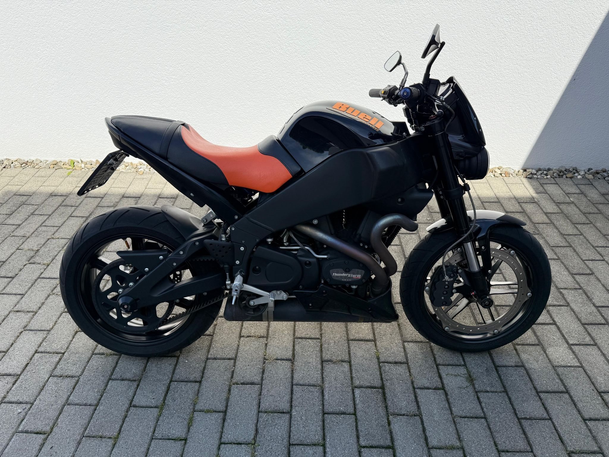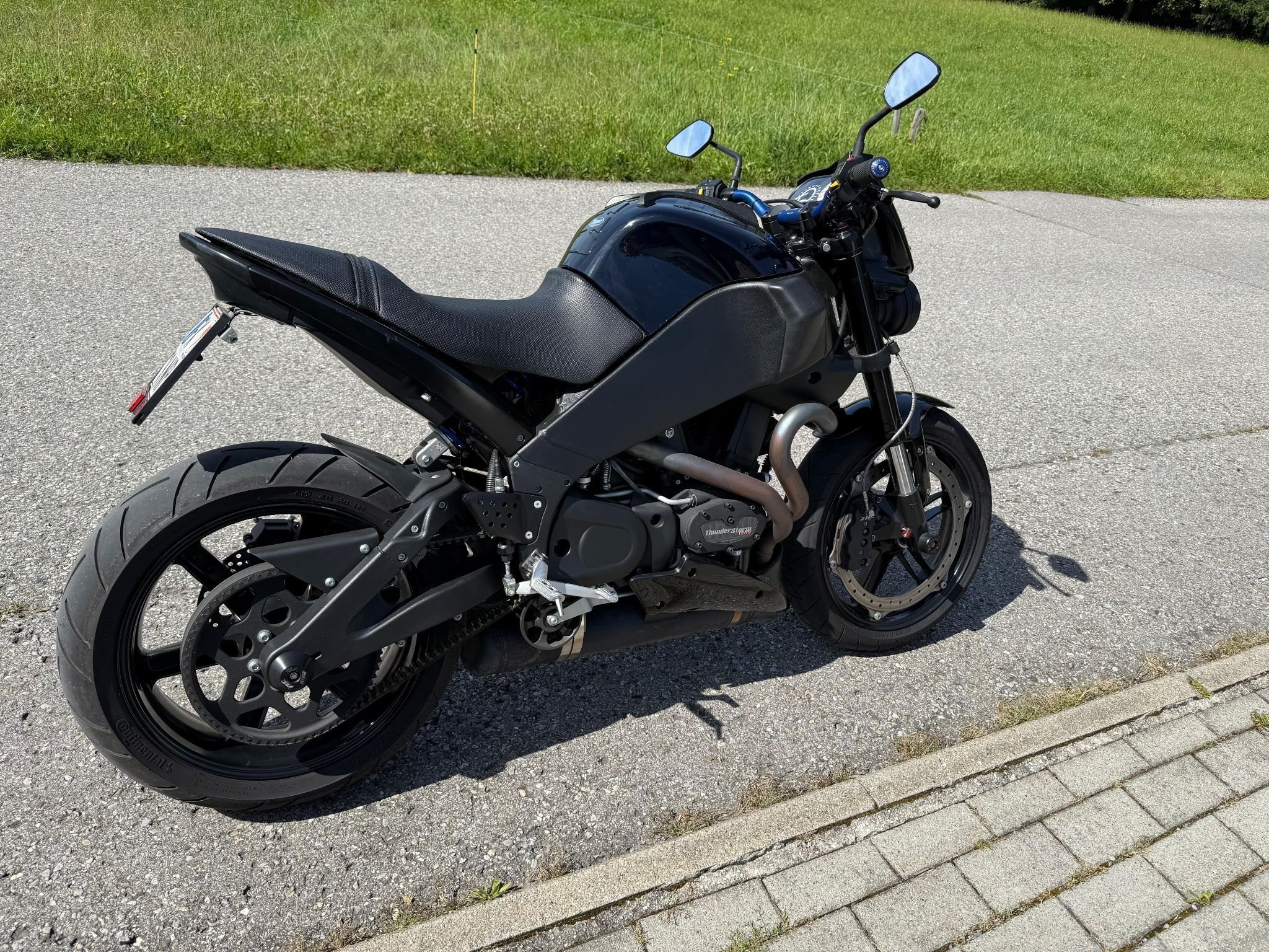 Verkaufe meine Buell im Topzustand, letzte Serie mit Erstzulassung 10 2009 Modell 2010, Thunderstorm 1203 Harley Motor mit 94 PS bei Drehzahl 7.000, 104 NM, 217 km h Höchstgeschwindigkeit, Trockengewicht 179 kg, zul. Gesamtgewicht 386 kg, 8 Kolben Festsattelbremse vorne, original-schwarzer Motorblock, Kellermann Miniblinker, K & N Luftfilter, Sturzschutz Achsen-Pads und am Rahmen, LED Rück- und Bremslicht, Sekundärantrieb: Aramid-verstärkter Goodyear Hibrex Belt mit Flexten Plus Technologie und konstanter Spannung sowie 14 mm Zahnflankenabstand