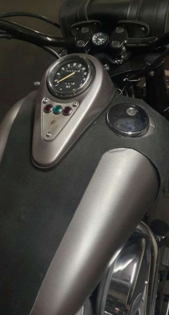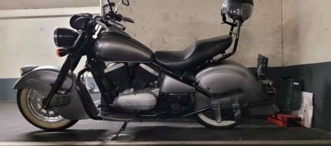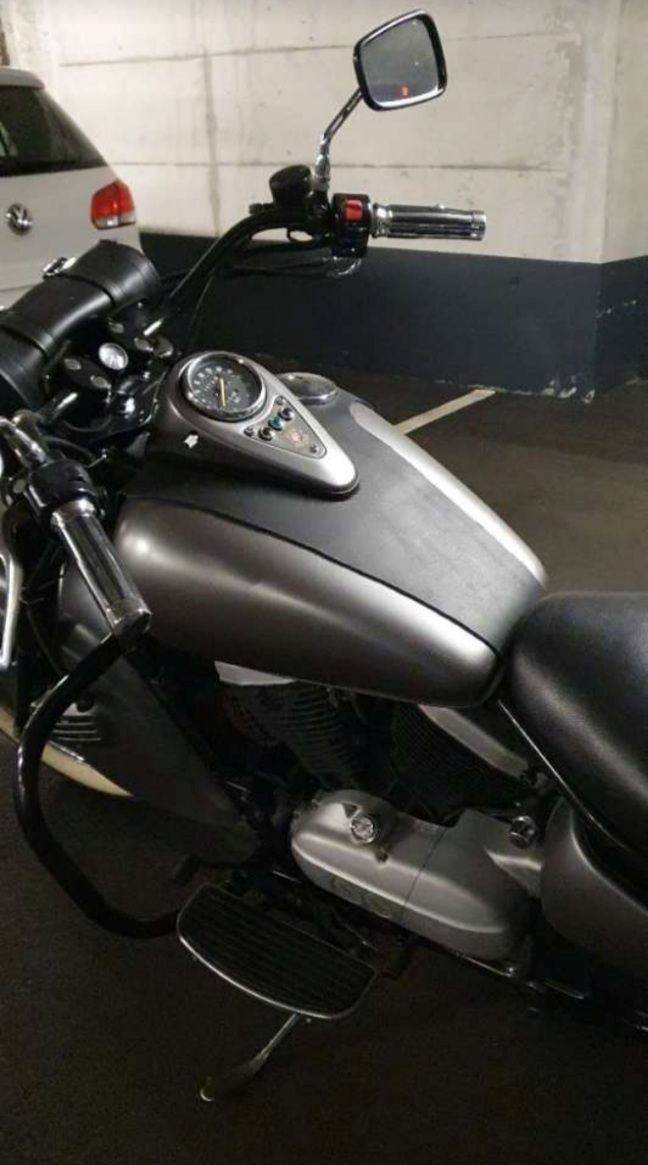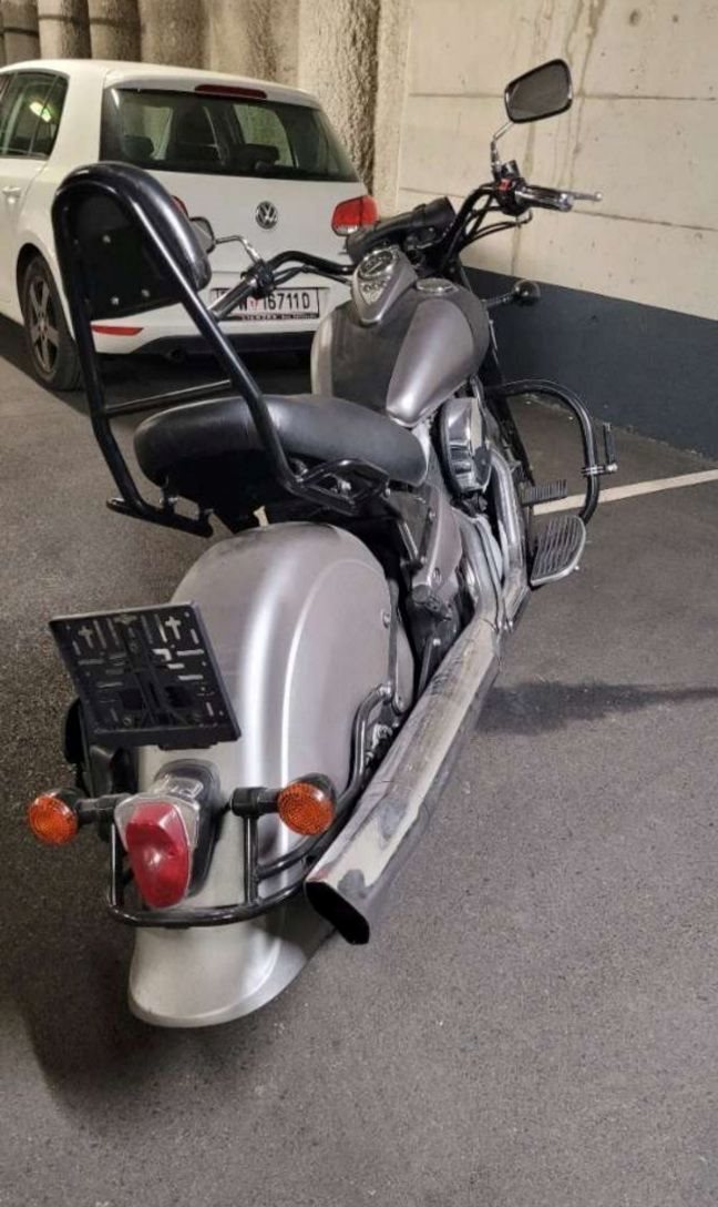 Der Vorbesitzer hat das Motorrad mittels Sprühfolie auf ihre aktuelle Farbe gebracht, matt grau.