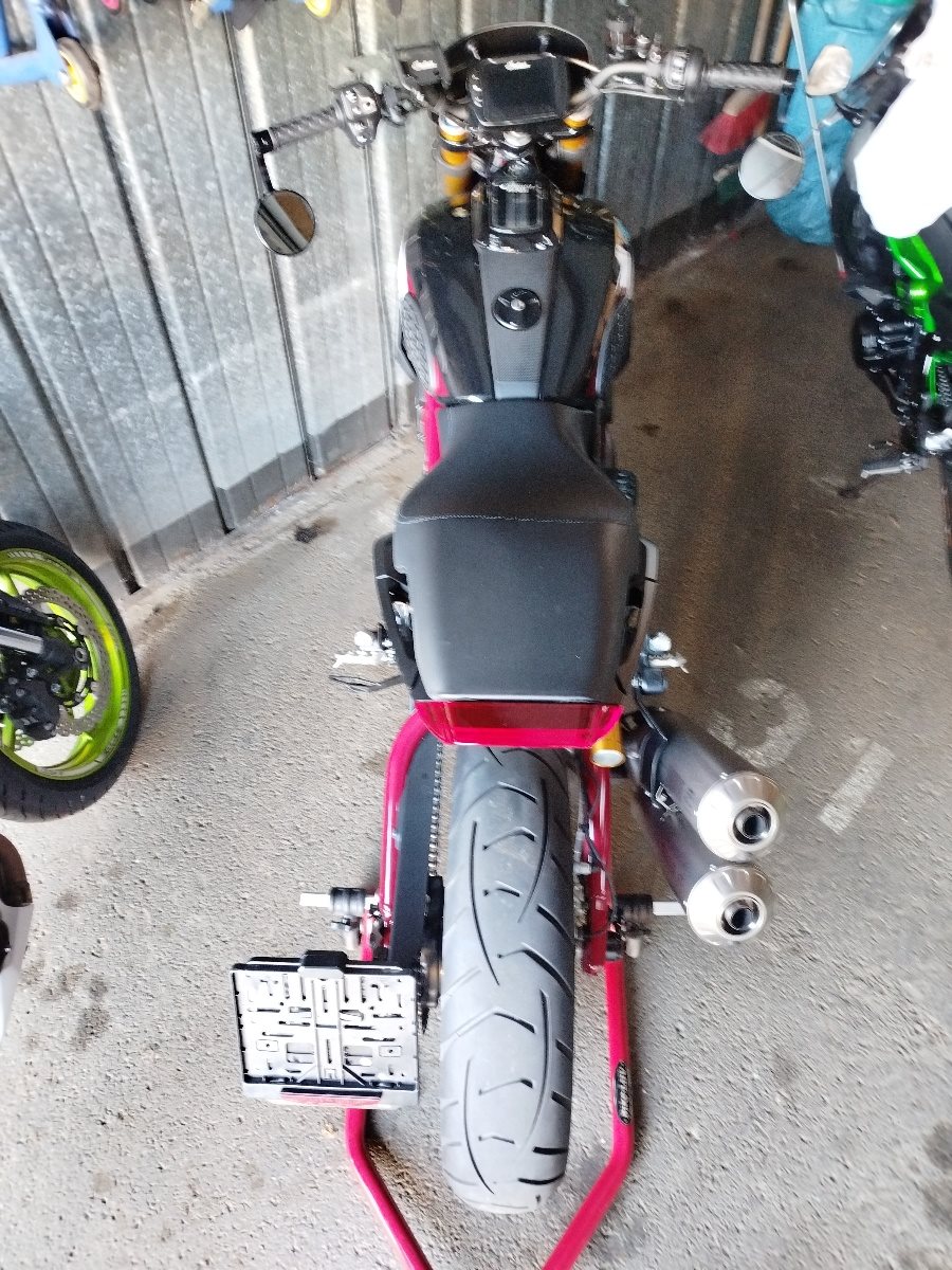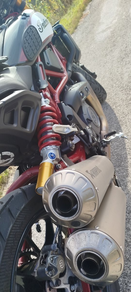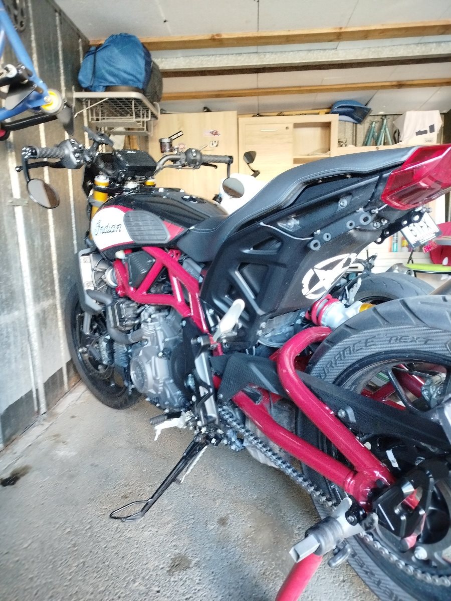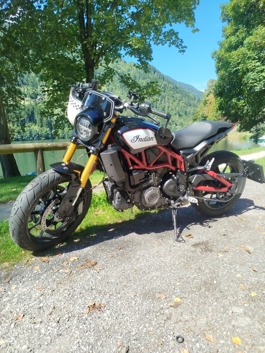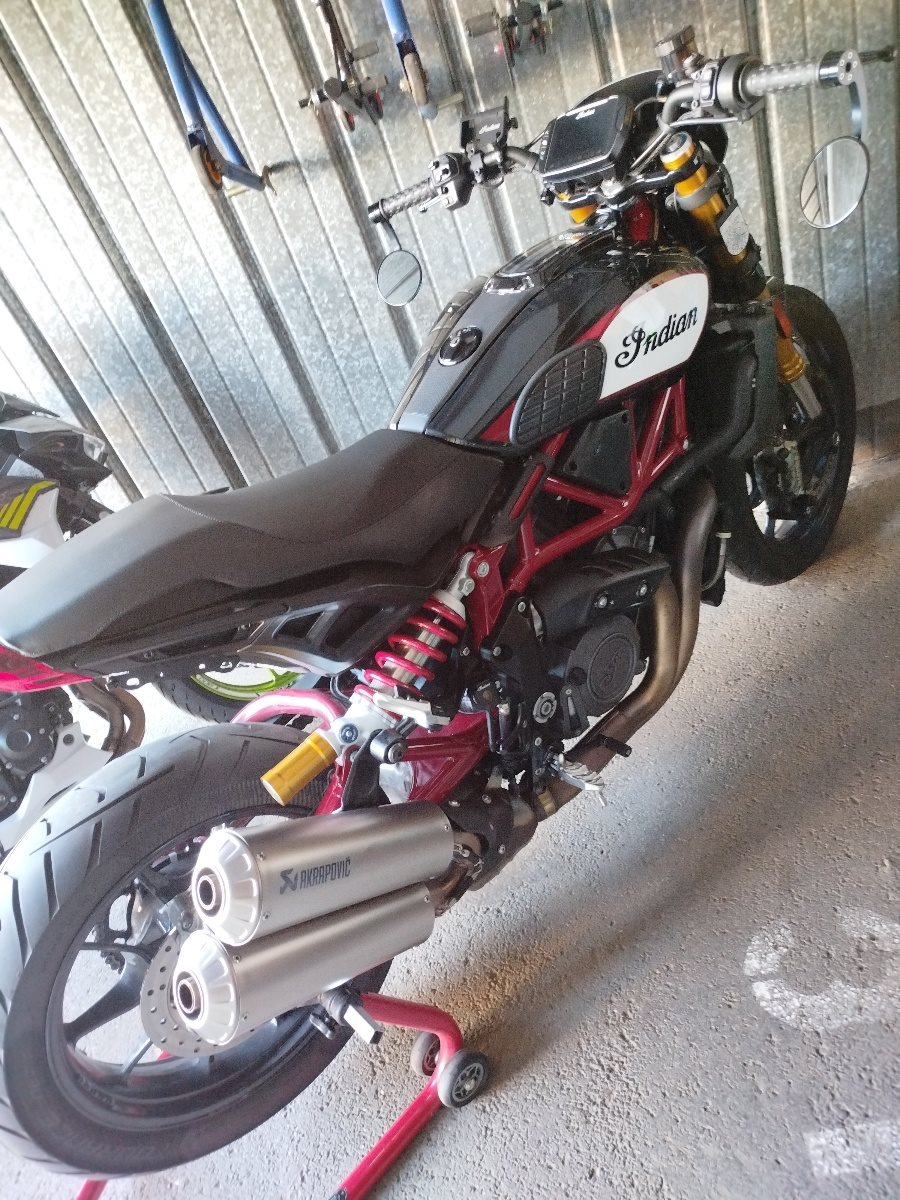 Die echte FTR noch mit 19 Zoll Vorder- und 18 Zoll Hinterreifen in der Top Ausführung Race Replica, seitliche Kennzeichenhalterung von Wunderkind, Lenkerenden Spiegel, Mini LED Blinker vorne und hinten, Tankpads seitlich, DYNOJET Power Vision Tuning (nicht bei 190 km/h abgeriegelt, mehr Kraft und Leistung), frisches Service Ende August