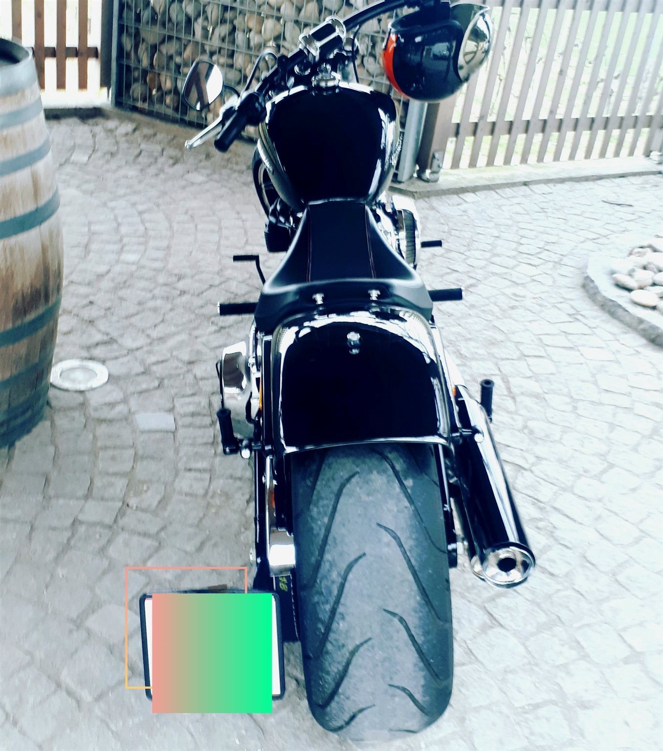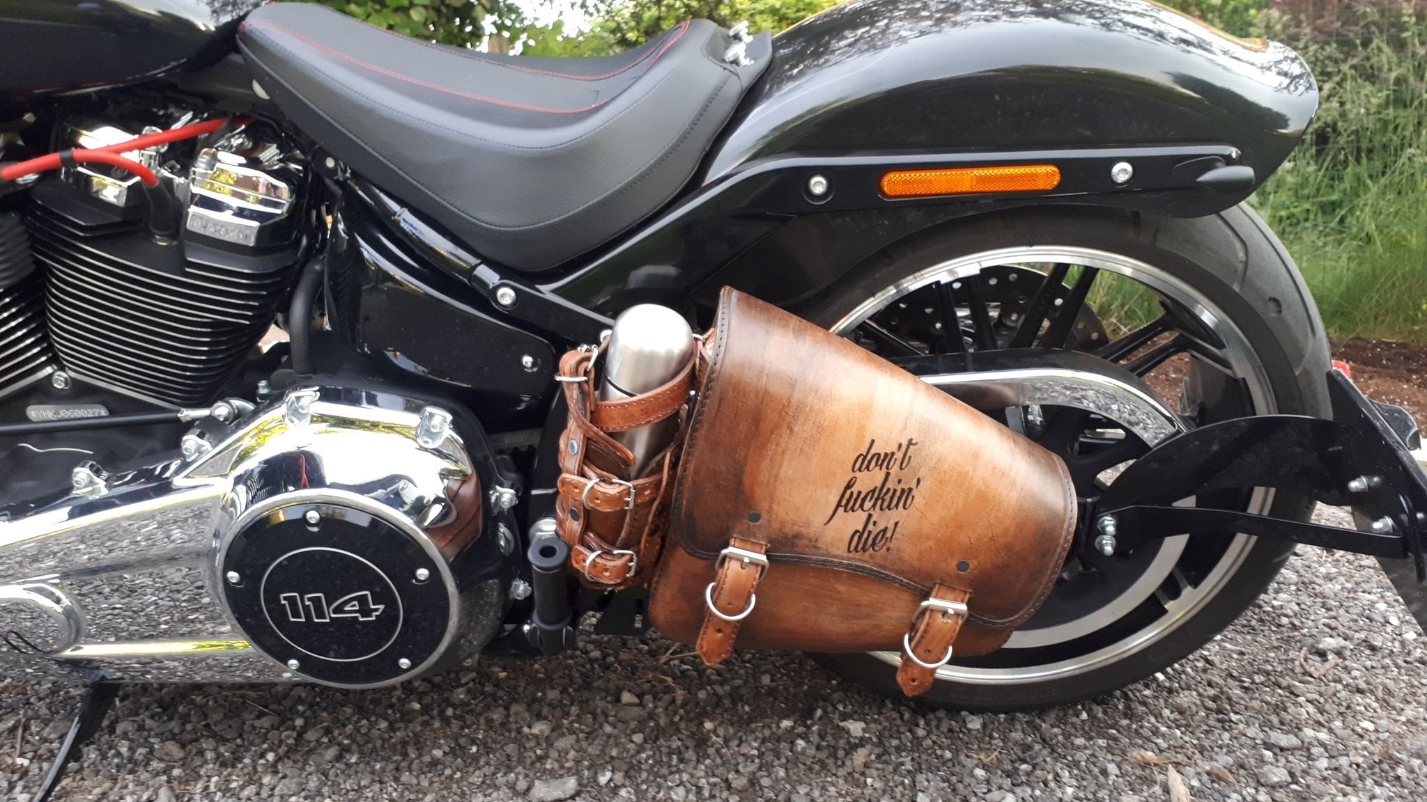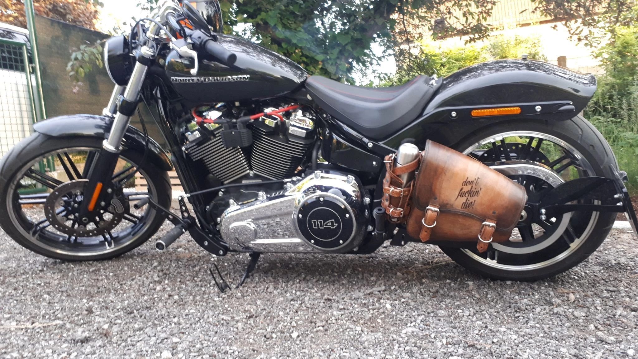 Harley Davidson Breakout in sehr gutem Zustand mit seitlichem Kennzeichen, vorverlegten Fußrasten, Bullet Blinker von Thunderbike, neuer Hinterreifen, handgefertigte Ledersatteltasche...
