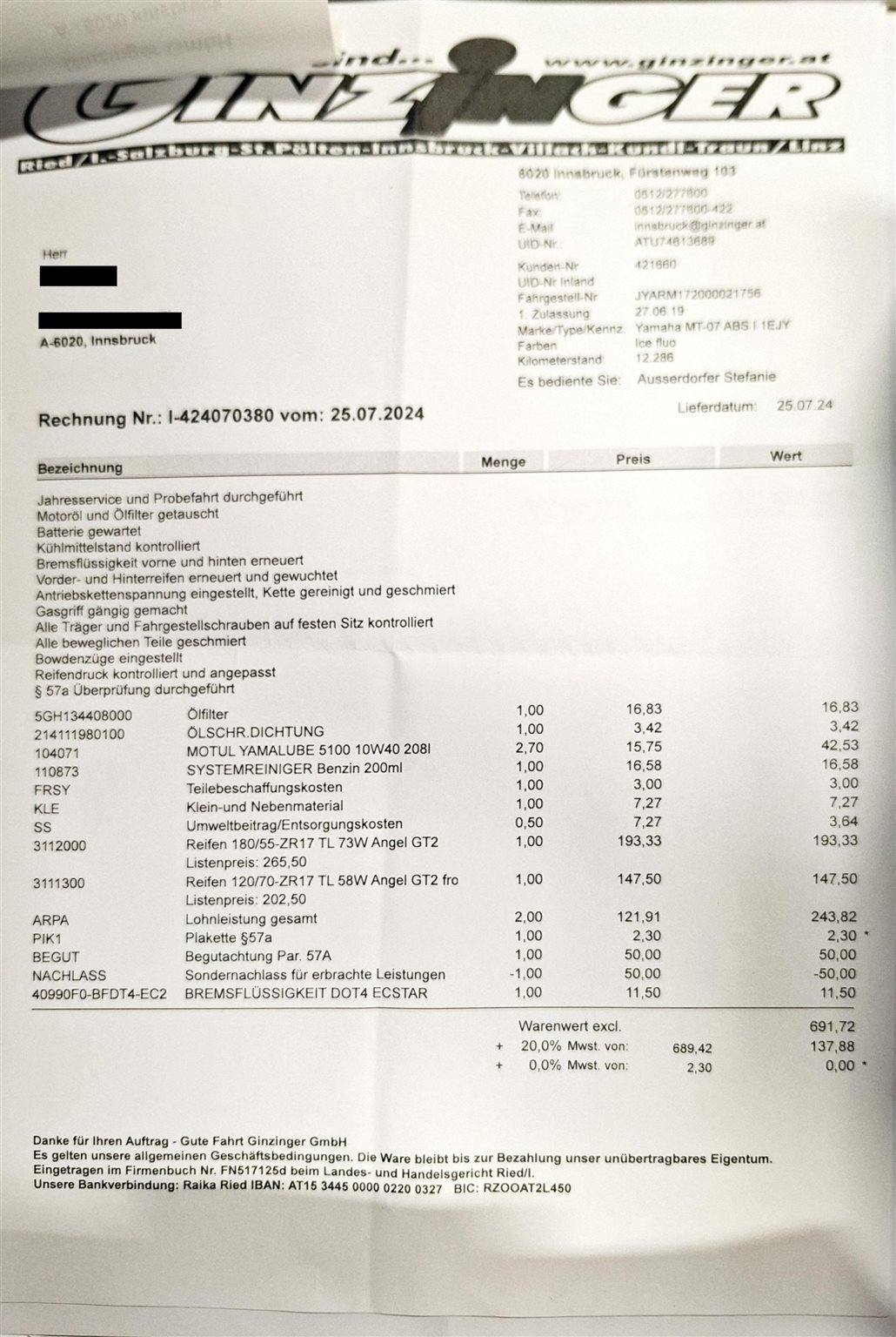 Letzter Service inkl. Reifenwechsel und Bremsflüssigkeitswechsel wurde am 25.07.2024 mit 12.286 km durchgeführt.