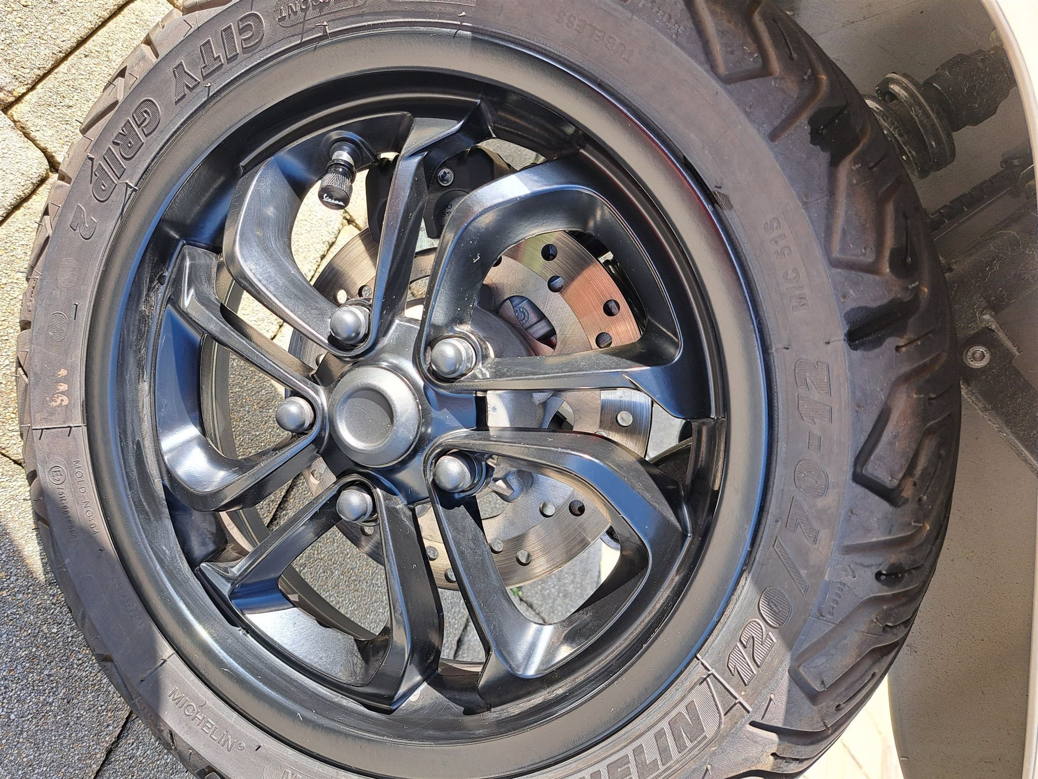 Bremsgriffe und Schwingenabdeckung in schwarz.