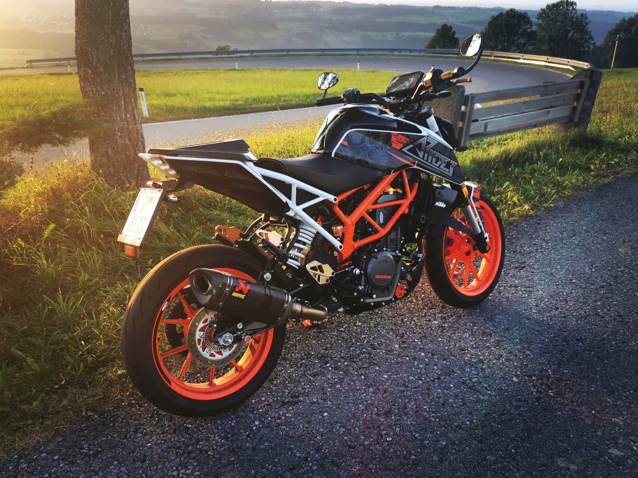 Akrapovic Slip-on Auspuff, Lenkerendspiegel, Ergo Fahrer und Beifahrer Sitzbank, Kurze Brems und Kupplungshebel mit ABE, mehrere eloxierte KTM Teile und eine Soziusabdeckung.