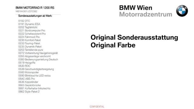 Fahrgestellnr: Z372382Heizgriffe, Tempomat, Warnblinkanlage, Windschild, ESA elektr.suspension Adjustment, Gepaeckbruecke, Koffer, Topcasehalter Eine schoene R1200RS inkl. Sonderausstattungen ab Werk siehe Bild 14 steht zum Verkauf., Zusaetzlich ist ein Topcase , 2 Seitenkoffer , ein Sturzbuegel sowie ein SC Project Auspuff verbaut., Gerne bieten wir auch eine entsprechende Finanzierung, Versicherung mit und ohne Kasko oder die Zustellung des Bikes nach Ihren Wuenschen an.Z372382, Sie koennen mich auch direkt kontaktieren : Christian Maurer 0676 888 755 224 oder christian.cm.maurer@bmw-wien.at