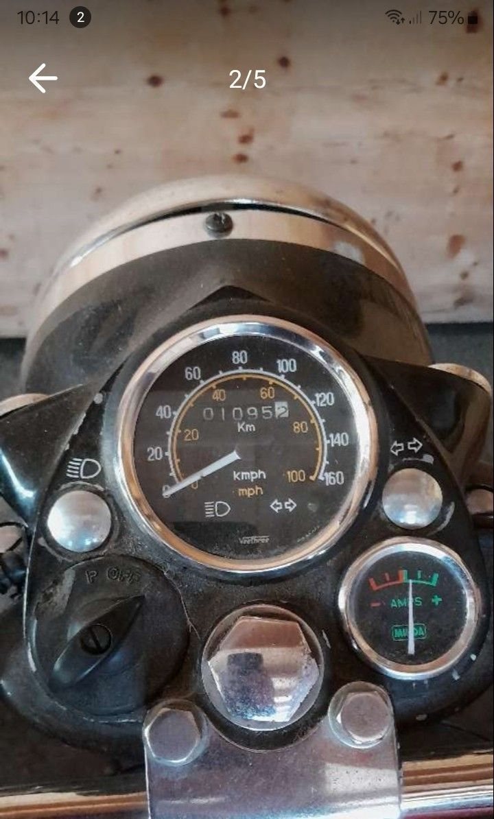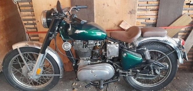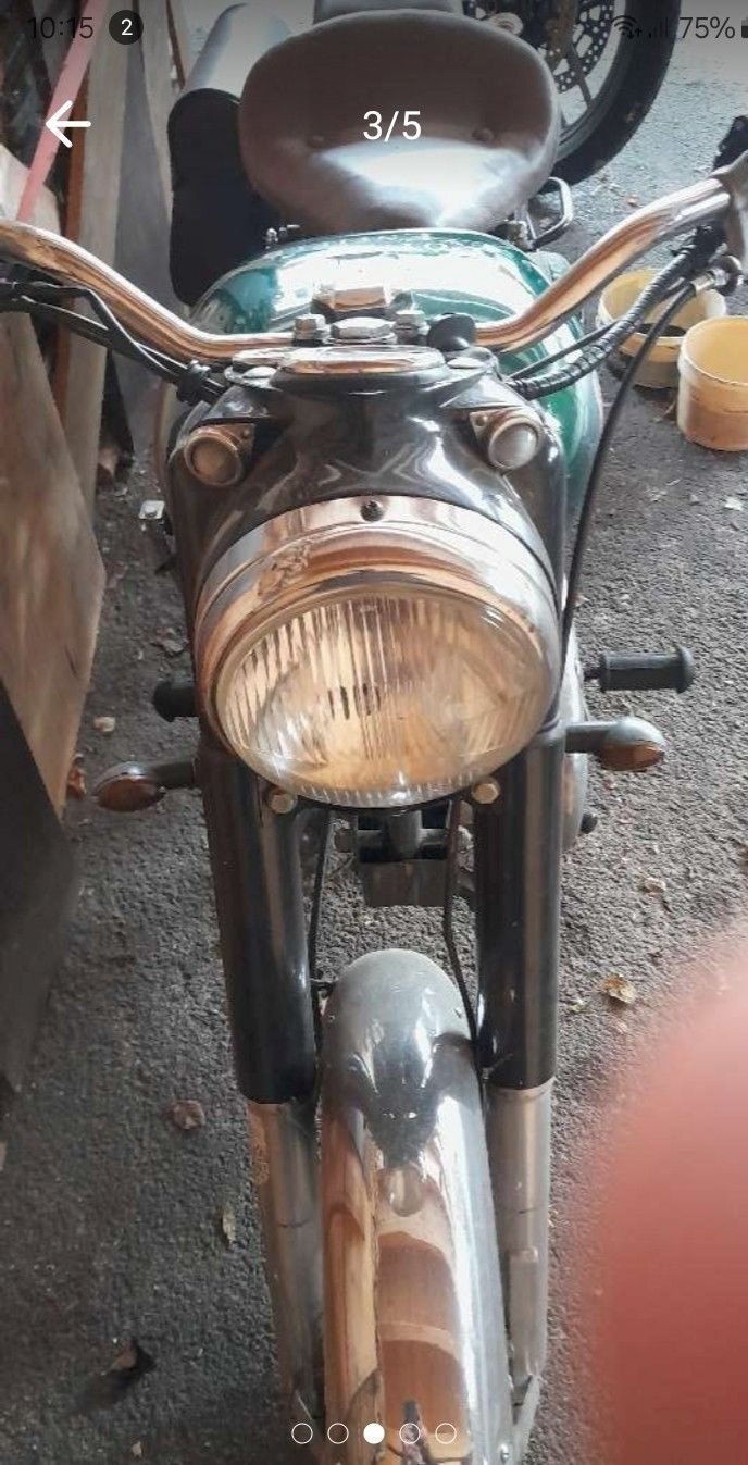 Vieles erneuert, umlackiert auf british green, Sitze in braunem Leder, Blinker neu, Elekrik tlw. neu, Dichtsatz kpl. als Ersatzteil vorhanden, ebenso Luftfilter-Vergaser Gummi, Batterie neu 2025, springt schwer an, Lederseitentasche.
