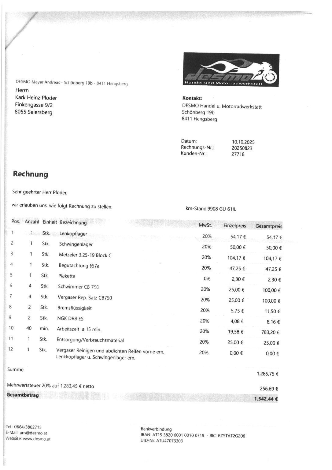 Schwingenlager hinten, Lenkkopflager, Vorderreifen neu, Vergaserservice komplett.