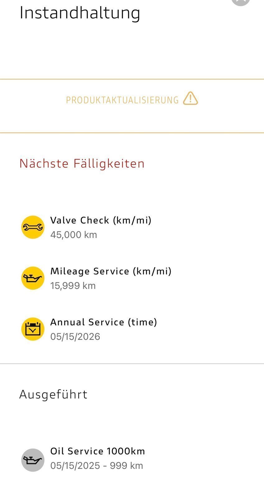 Wurde, wie von Ducati vorgegeben, ordnungsgemäß eingefahren (keine Autobahn, nicht über 6000 gedreht etc. ist Auslesbar) und Ölservice bei 999km durchgeführt.