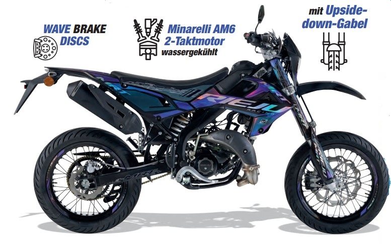 Exklusiver einstieg ins Motorradwelt! Die RIEJU MRT Europa ist der Erste Schritt ins Supermoto Feeling. Der starke wassergekühlte Minarelli AM6 Motor katapultiert die MRT auf die Straße. Das geringe Gewicht, die perfekt abgestimmte Federung, 130mm breite Hinterradreifen kleben wie ein Kaugummi auf dem Asphalt.