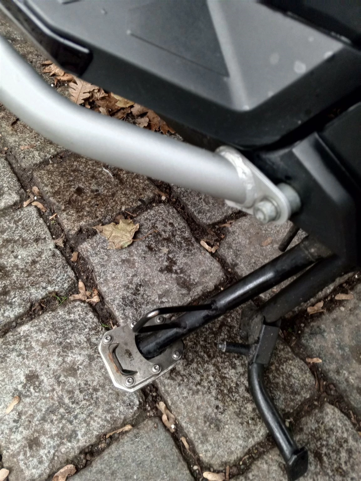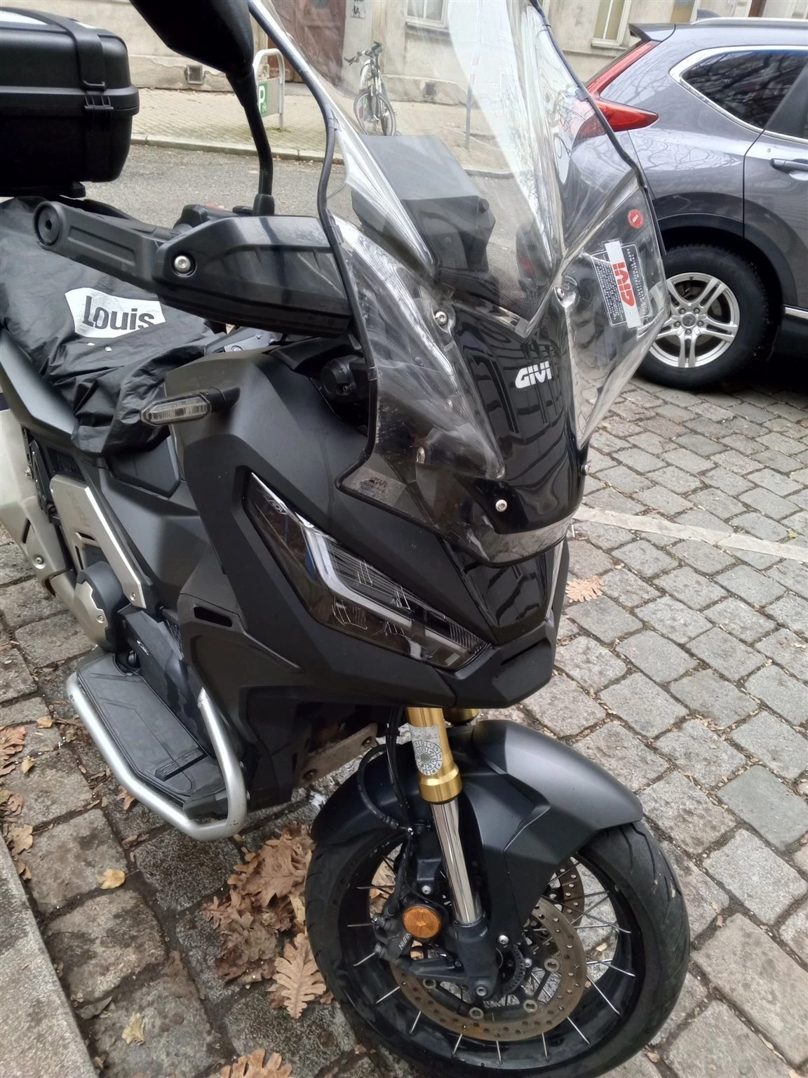 Topcaseträger, größere Windschutzscheibe und Seitenständerverbreiterung (alles GIVI), Heizgriffe, Handguards und seitlicher Aufprallschutz (Original Zubehör). Originale Haltegriffe und Windschutzscheibe vorhanden.