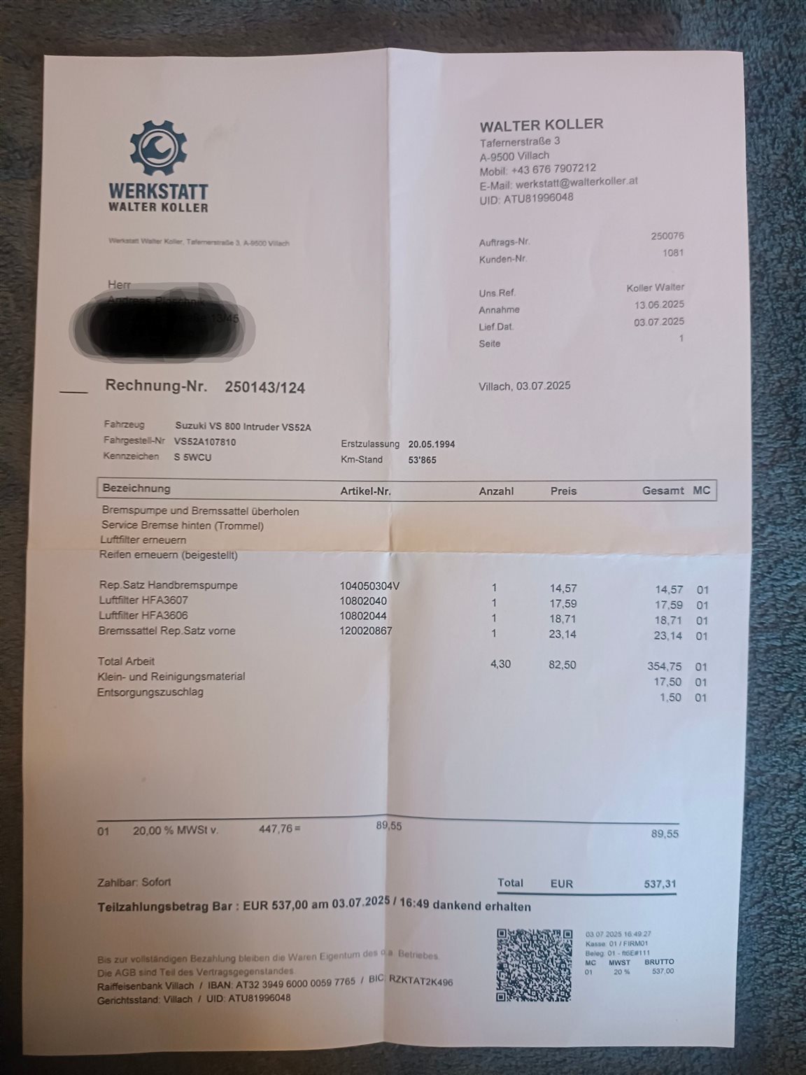 Öl inkl Filter, Kühler Flüssigkeit, Kardan öl, Bremsflüssigkeit inkl. Flexi Bremsschlauch!