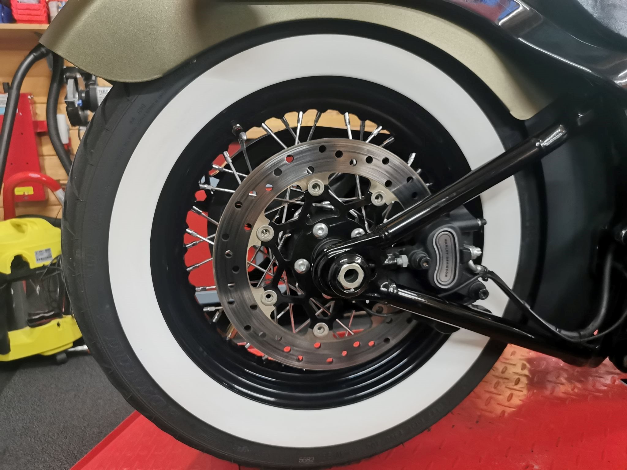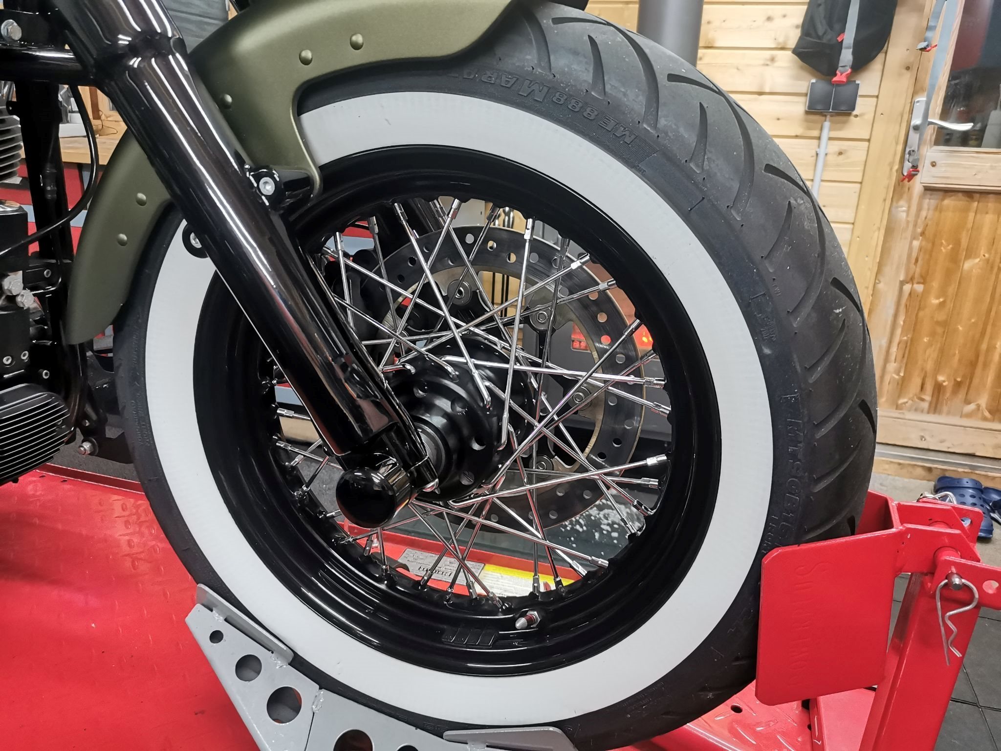 Umgerüstet auf Weisswandreifen. Vorderer Reifen Neu/hinterer Reifen ca 60%.