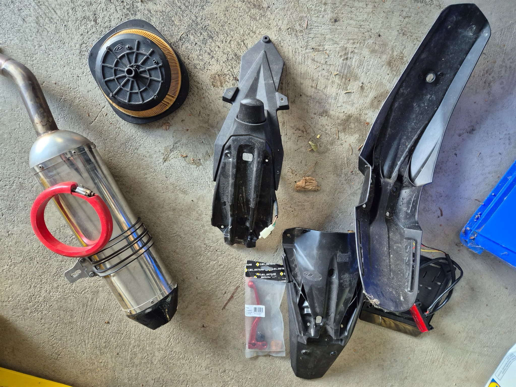 Einige Ersatz- und Originalteile sind auch dabei: ein Straßenzugelassener Sportendtopf, der originale Luftfilter und ein paar optische Teile (Eloxierter Griff, kürzerer Fender...)