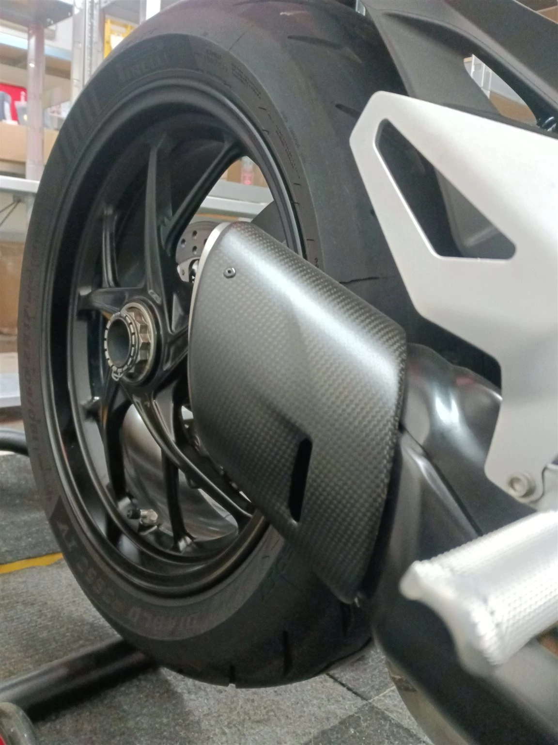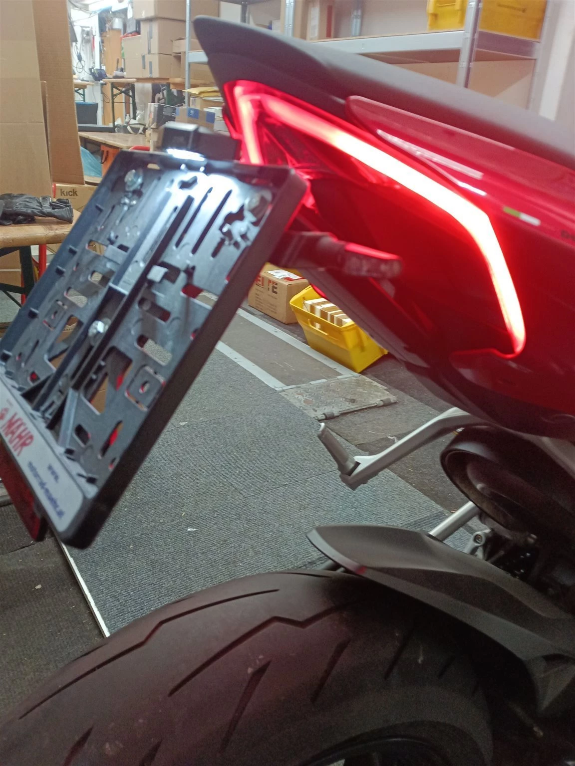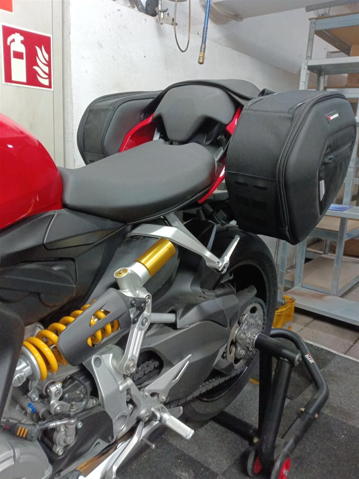 Carbonauspuffblende, Rizoma Flüssigkeitsbehälter, kurzes Heck, Miniblinker, Puig Windschild, SW-Motech Blaze Satteltaschen. Dazu ein passender Heckständer.