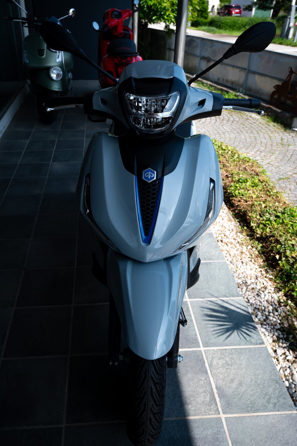 Luxuriöse Dynamik Die Piaggio Beverly S besticht durch ihre sportliche Seele, die sich in einem matten Graphit-Finish an Details wie den Felgen, dem hinteren Haltegriff sowie den Rahmen der Instrumententafel und des LED-Scheinwerfers ausdrückt. Blaue Akzente auf dem S des Logos, dem Vorderrad und der charakteristischen Krawatte unterstreichen den Charakter. Die markante Front mit dem V-förmigen Lufteinlass und dem Kühlergrill mit Wabenmuster sowie das schnittige Heck und die zweifarbigen Nähte der Sitze vervollständigen das Design. Die perfekte Verschmelzung eines sportlichen Hochrad-Rollers mit einem leistungsstarken GT. Die Leistung eines Crossovers Angetrieben von einem modernen Euro 5+ Einzylindermotor mit Kraftstoffeinspritzung und Flüssigkeitskühlung, festigt die Piaggio Beverly S 310 ihre Stellung als perfekter Roller für den Stadtverkehr und für mittlere bis lange Touren, mit oder ohne Beifahrer. Die 27,7 PS und das ausgezeichnetes Drehmoment vereinen Kraft mit sanfter Leistungsentfaltung und sorgen für ein dynamisches und gleichzeitig leicht zu beherrschendes Fahrverhalten. Die reduzierten Geräusche der Mechanik und des Antriebsriemens erhöhen die Effizienz zusätzlich und machen die Piaggio Beverly S zur perfekten Kombination aus Kontrolle und Fahrspaß. Nahtlose Technologie Die fortschrittliche Instrumentierung der Piaggio Beverly S wurde entwickelt, um jeden Moment auf dem Sitz zu erleichtern. Auf dem digitalen 5,5-Zoll-LCD-Display hat man alle Informationen zur Fahrt im Blick. Mit einem einfachen Druck auf die MODE-Taste auf dem rechten Steuerblock lässt sich mühelos durch Geschwindigkeit, Kraftstoffverbrauch, Reichweite und Batterieladestand navigieren. Das ebenfalls serienmäßige Keyless System bringt den Komfort auf ein neues Niveau: man kann den Motor starten, die Sitzbank öffnen und die Lenkersperre (de)aktivieren, während man die Fernbedienung bequem in der Tasche hat. Kurzum: Technologie und Funktionalität in perfekter Harmonie.