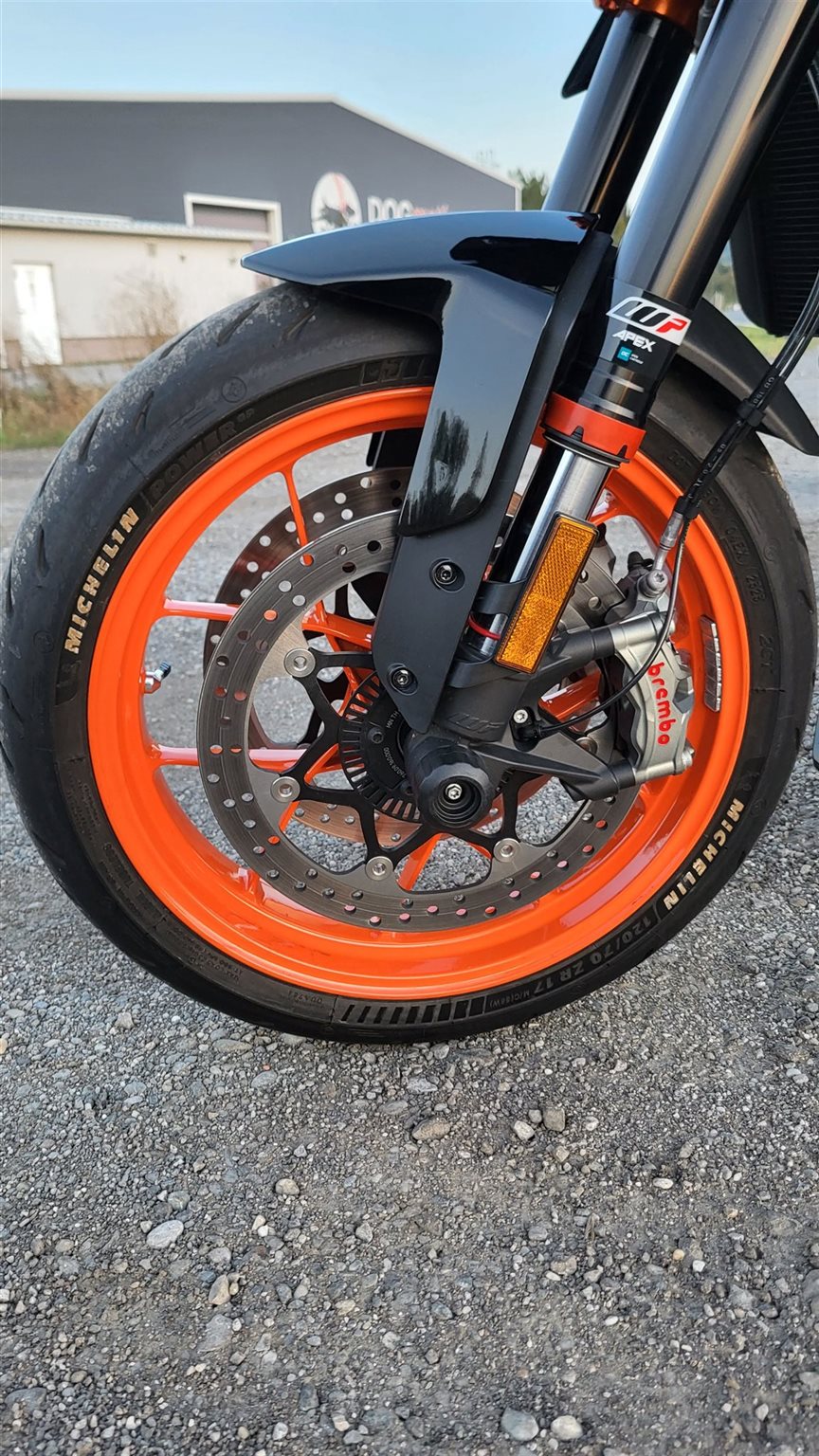 Am Motorrad sind viele KTM-Powerparts und andere Teile verbaut: