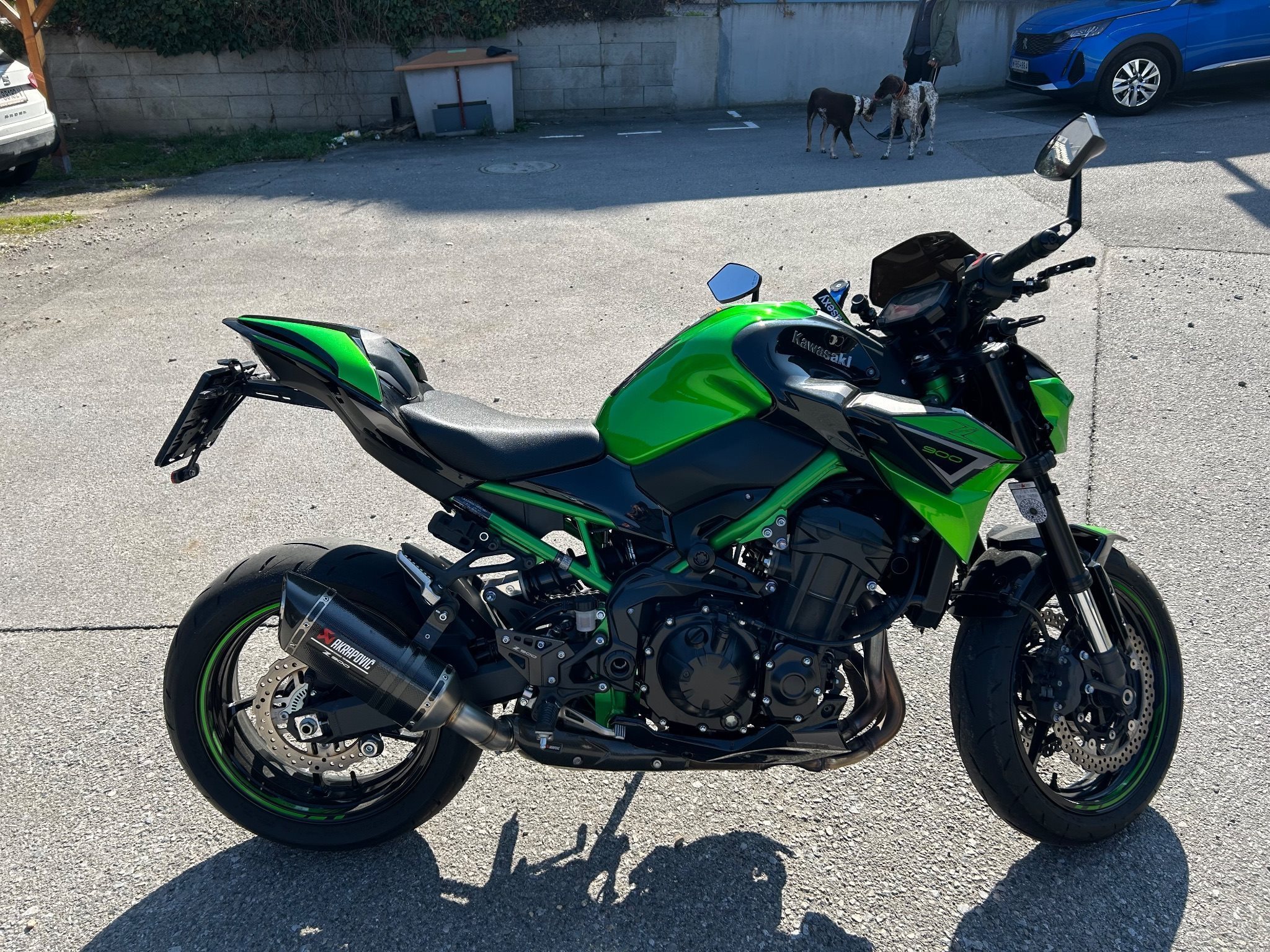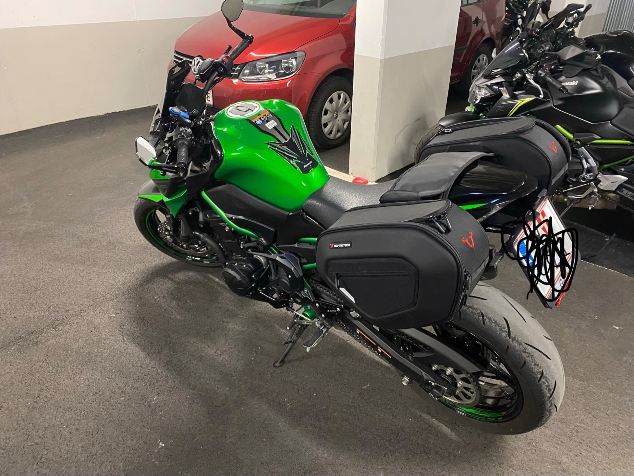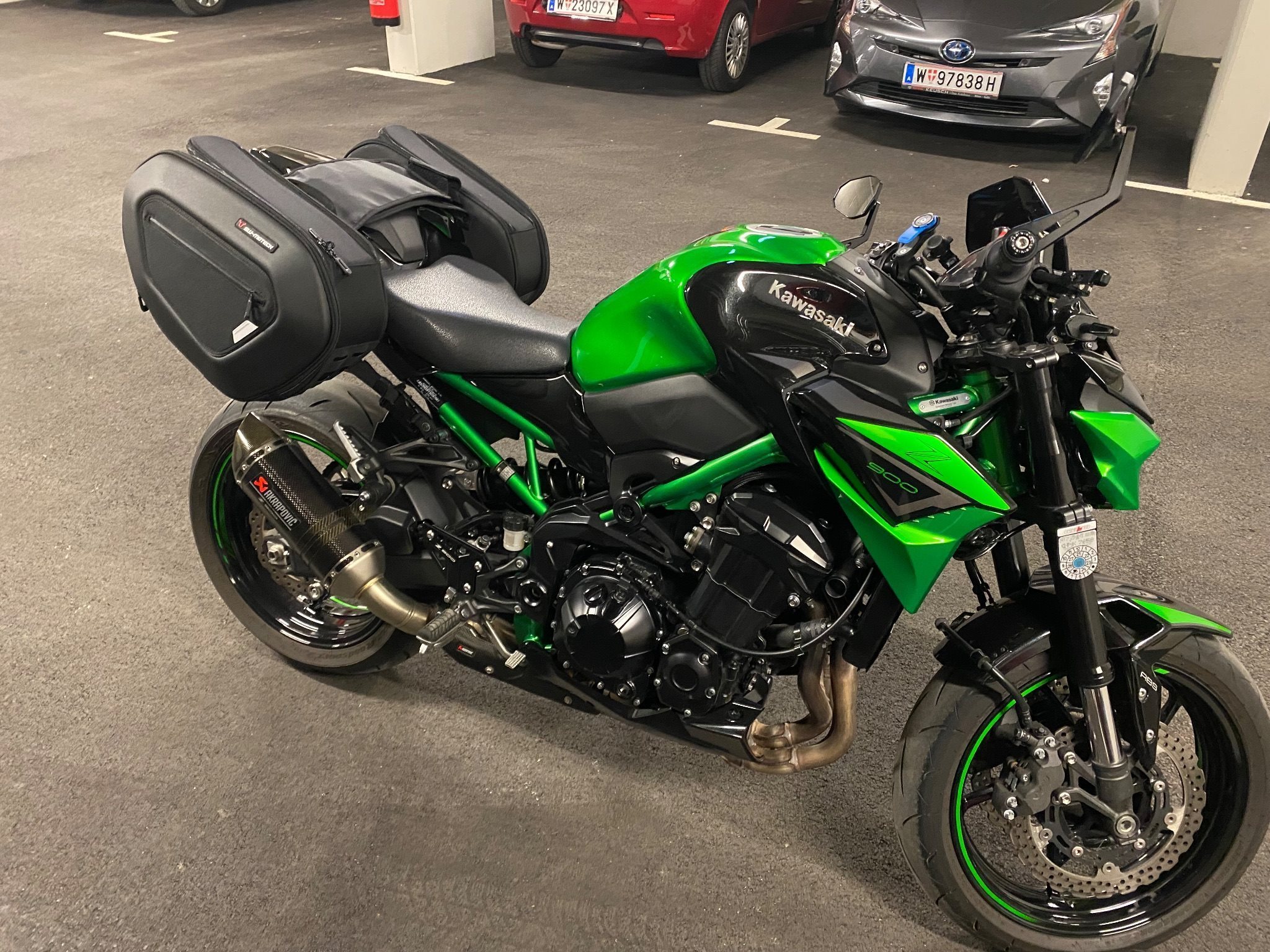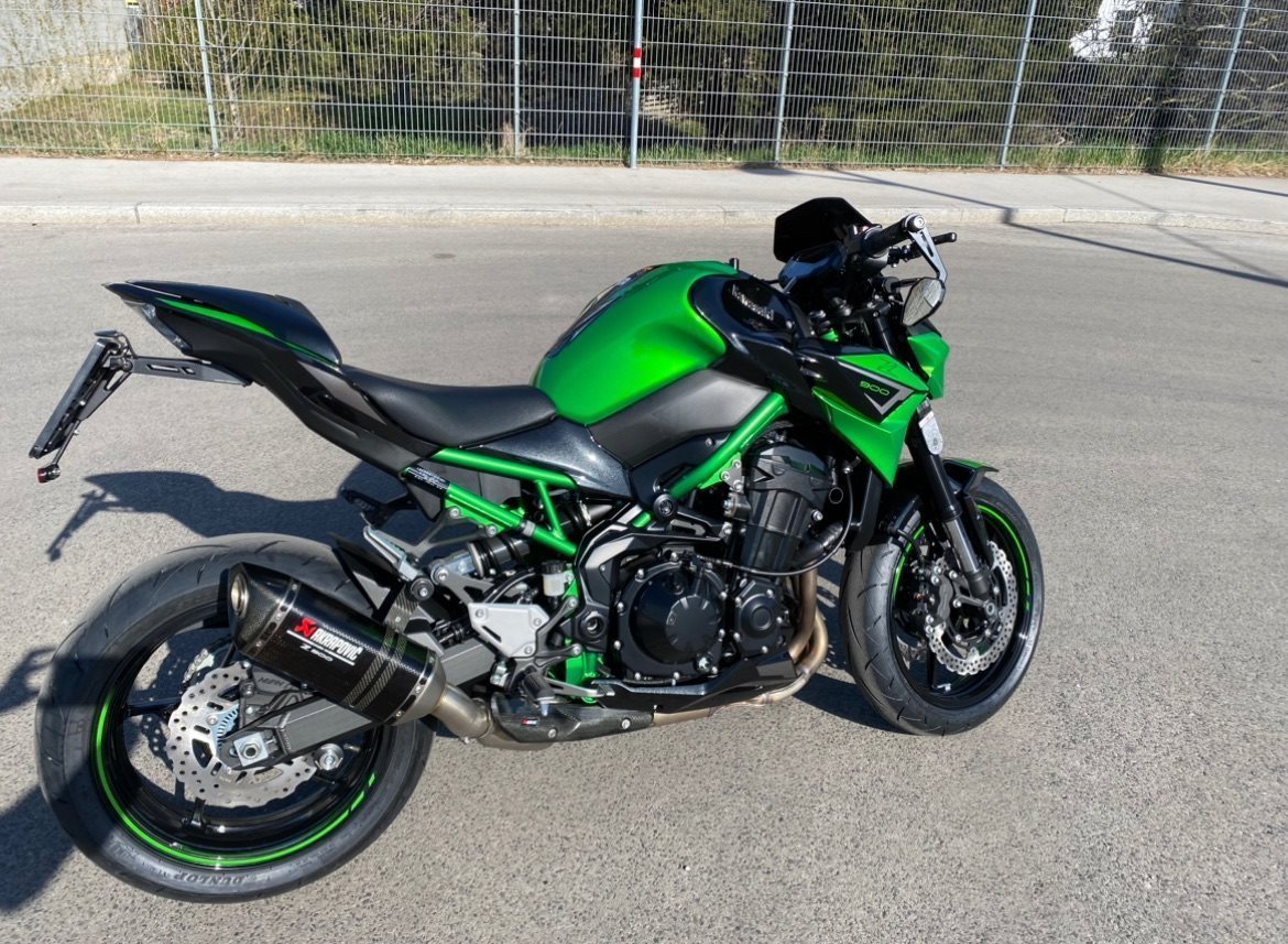 Laufblinker, Z900 Performance Paket Aktapovic, Highsider Spiegel + Lenkerenden, Brems- und Kupplungshebel in schwarz, Z900 Fersenschutz, Windschild getönt, Soziusabdeckung mit gesonderter Lackierung (Grün/Schwarz), Quadlock Handyhalterung mit USB Ladefunktion direkt daneben, SW Motech ProBlaze Satteltaschen zum ab- und anmontieren um sie auch im Alltag verwenden zu können, etc…