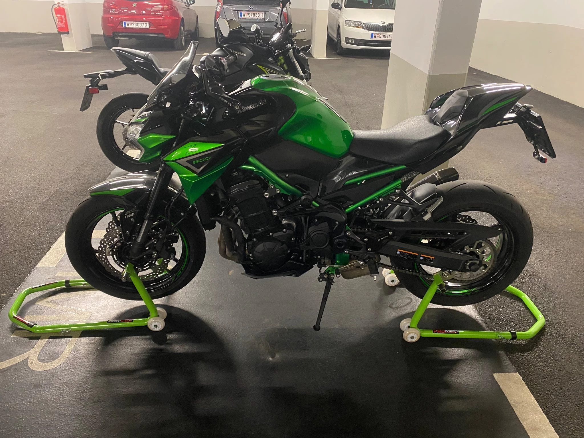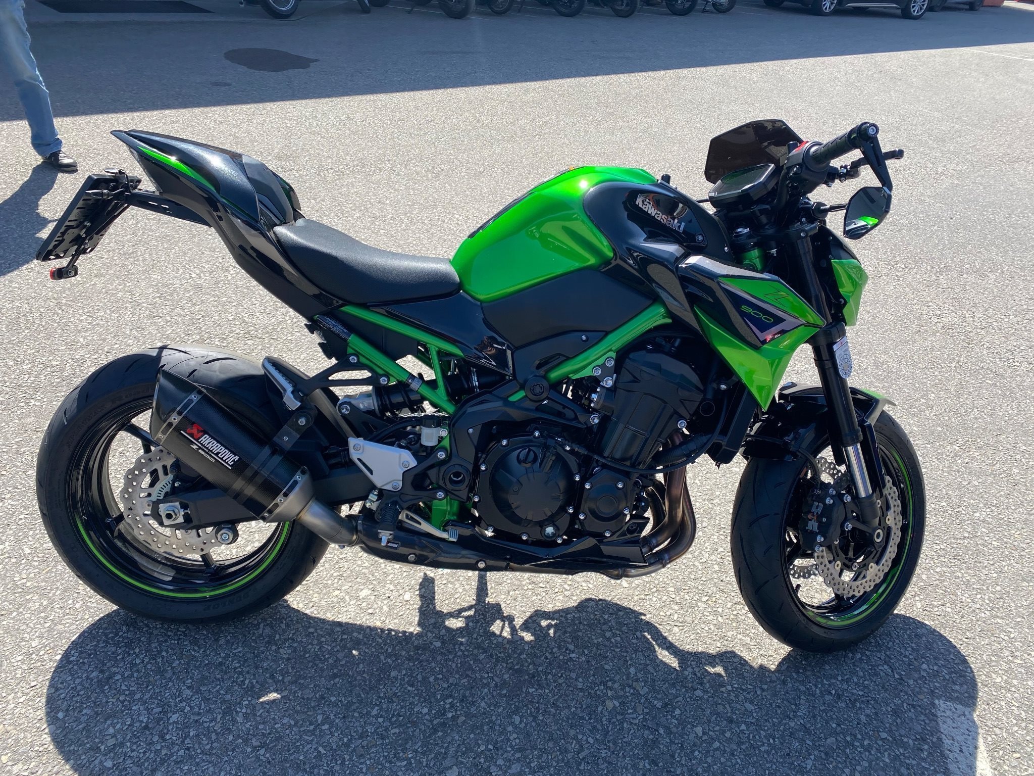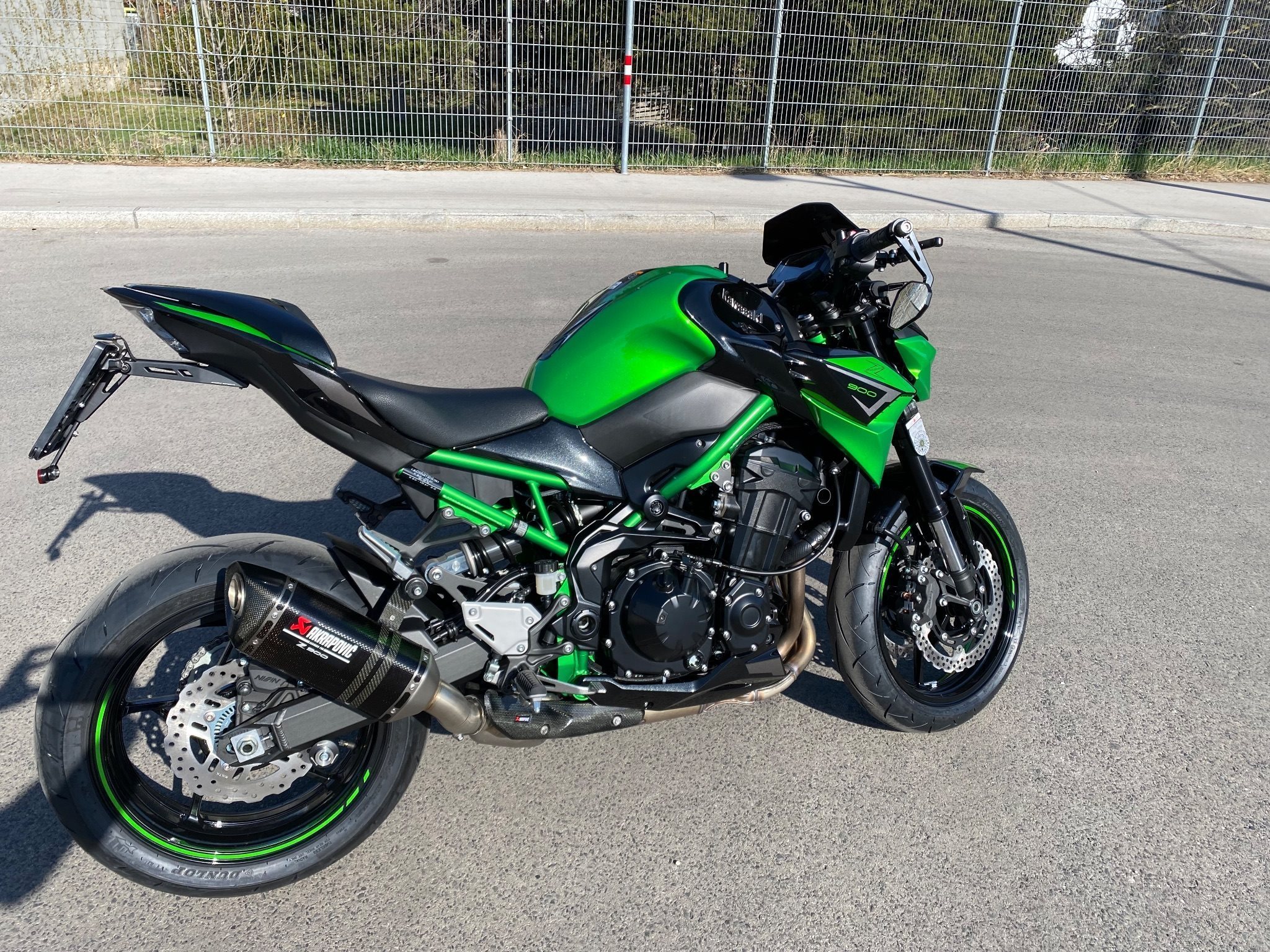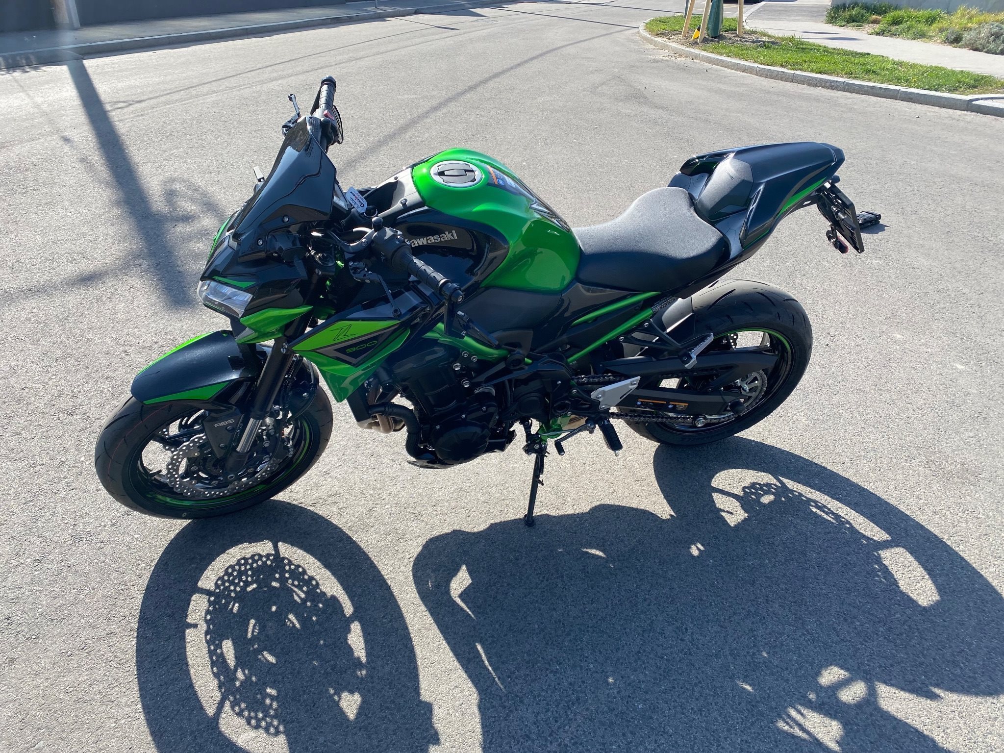 Laufblinker, Z900 Performance Paket Aktapovic, Highsider Spiegel + Lenkerenden, Brems- und Kupplungshebel in schwarz, Z900 Fersenschutz, Windschild getönt, Soziusabdeckung mit gesonderter Lackierung (Grün/Schwarz), Quadlock Handyhalterung mit USB Ladefunktion direkt daneben, SW Motech ProBlaze Satteltaschen zum ab- und anmontieren um sie auch im Alltag verwenden zu können, etc…