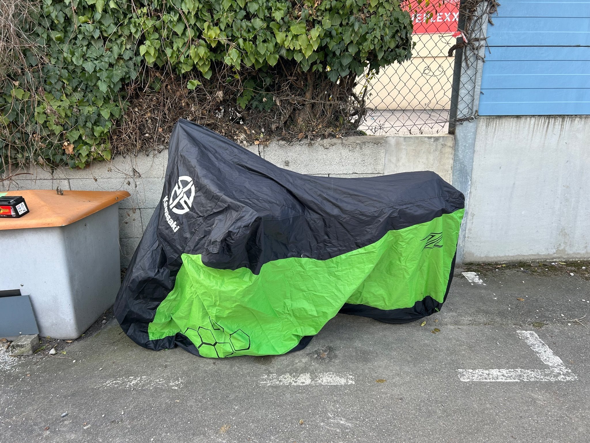 Bis heuer stand sie übern Winter in einer Garage. Jetzt muss sie leider draußen unter eine Kawasaki Abdeckung überwintern.