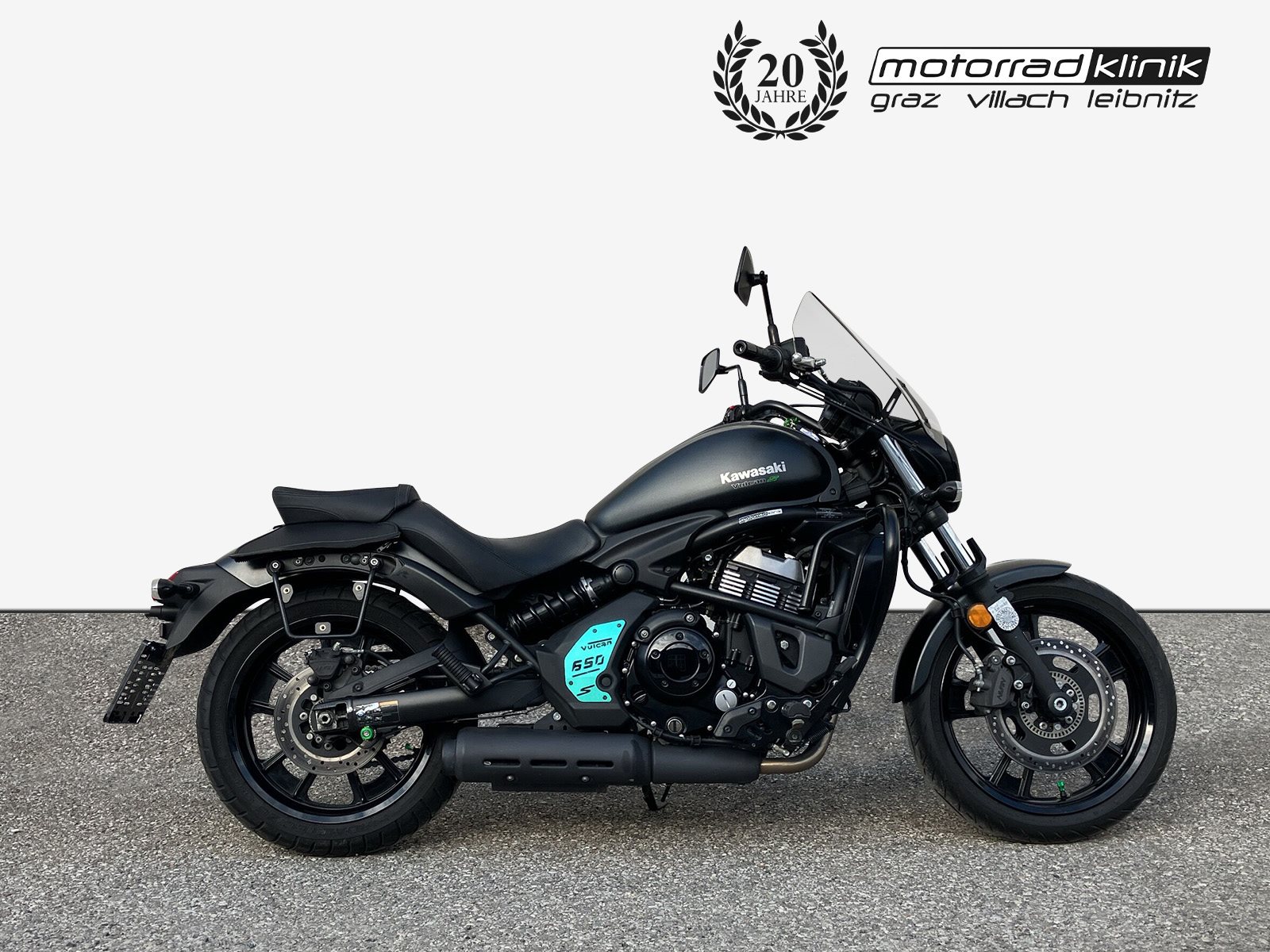 Schöne Kawasaki Vulcan S 650 mit ABS in schwarz inkl. große Scheibe, Sturzbügel von Hepco & Becker, Seitentaschen Halter.