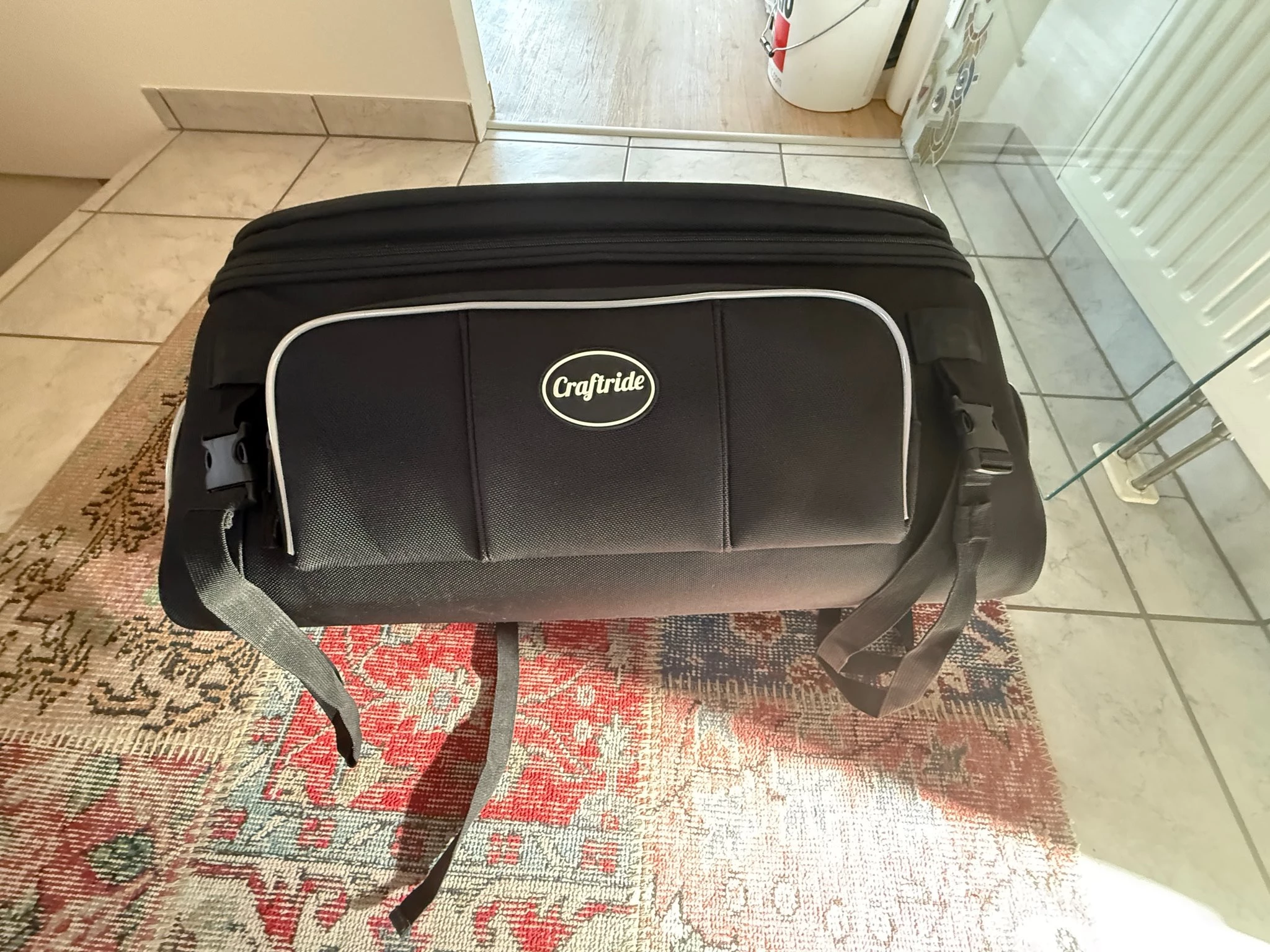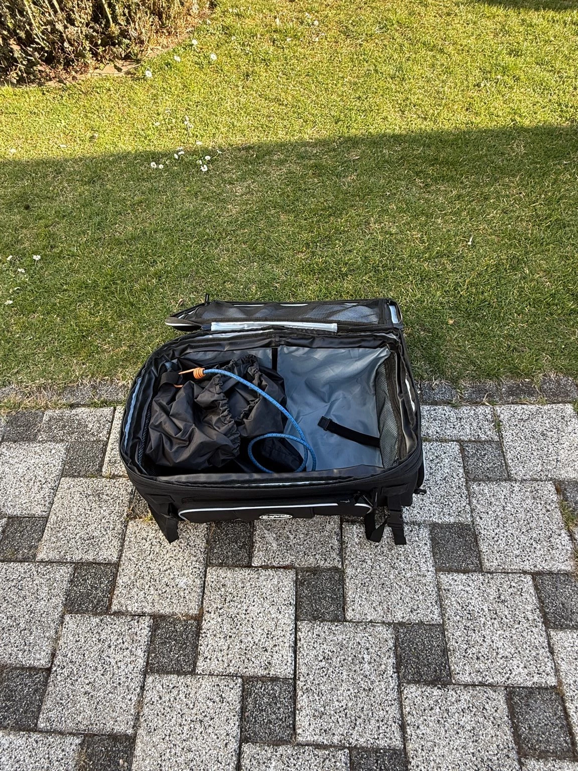Ein zusätzlicher Motorradkoffer mit Regenschutz ( siehe Bilder ) für Langzeiturlaube und zum Befestigen am Gepäcksträger mit Spanngummis ist im Preis inbegriffen.