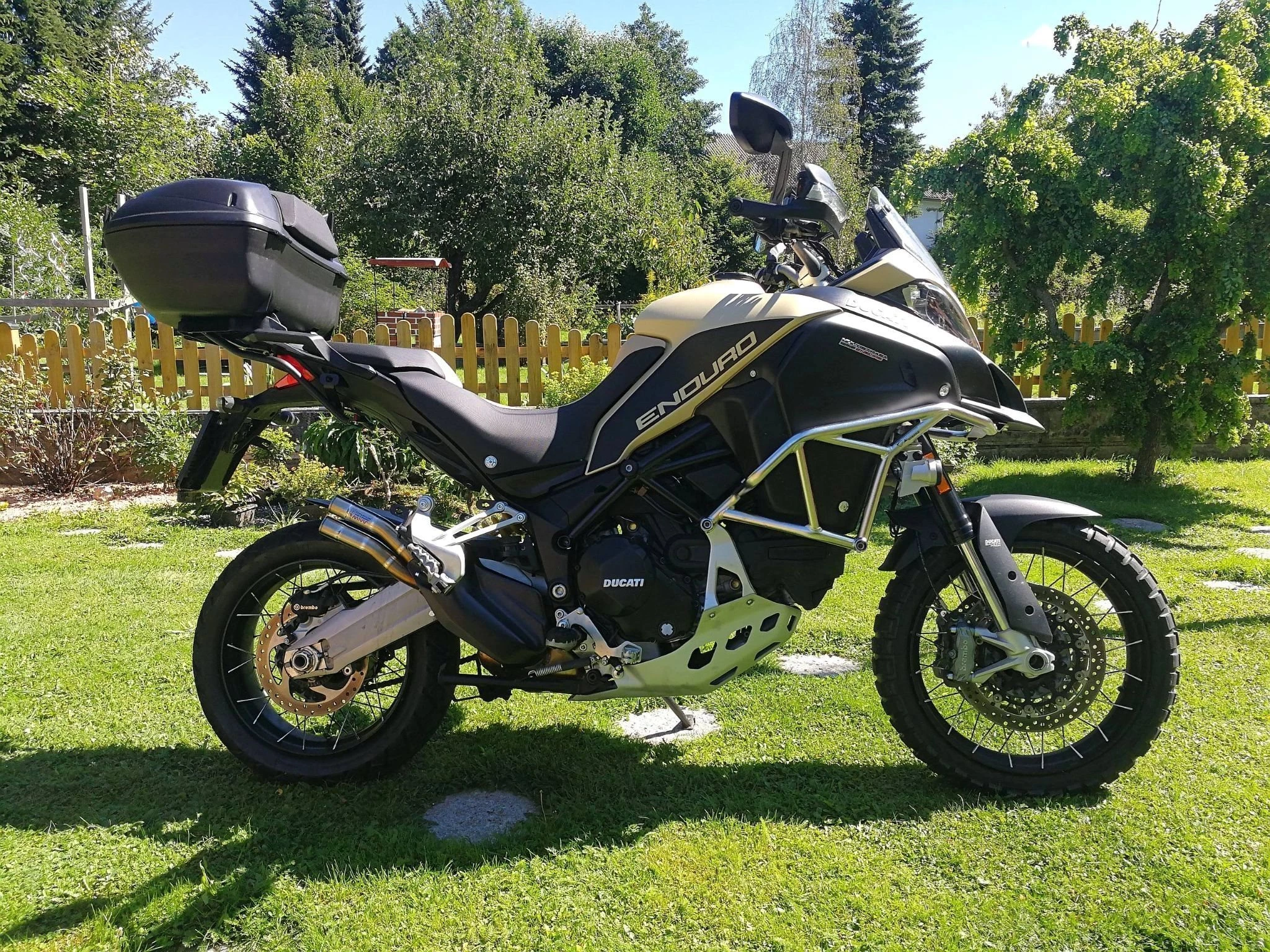 verkaufe meine sehr schöne Ducati Multistrada 1200 Enduro Pro. Erstbesitz Juni 2019, 152PS, 136Nm, jedes Service bei Ducati gemacht, Desmotronik Zahnriemen wurden Ende 2024 nach Service Plan gemacht, aktuell 15900Km, Hauptständer, Zusatzscheinwerfer, Tempomat, 30 Liter Tank, es wurde zusätzlich beim Neukauf eine original Griff Heizung montiert (original Griffe vorhanden), Ducati Topcase +Halterung, SW-Motec Alu Seitenkoffer (je 45 Liter)+einfach demontierbarer Halterung für verbesserte Optik, wenn die Koffer nicht benötigt werden ist kein Gestänge zu sehen, Tankrucksack, MIVV Double Gun Slip on Auspuff (Typengenemigt) original Auspuff vorhanden. Listenpreis war € 26.150.-, + € 2.250.- Zubehör, das Motorrad ist praktisch wie neu, kein Um-bzw. Unfall, Bereifung vorne = neu+hinten 3/4 Profil, Conti TKC 70, ich habe bisher noch keine 2. Multi in dieser Farbe und Ausführung gesehen. Besichtigung möglich, Probefahrt im Moment nicht, das Fahrzeug ist angemeldet, aber "still gelegt" und gut verpackt "eingewintert". VB €14.777.-