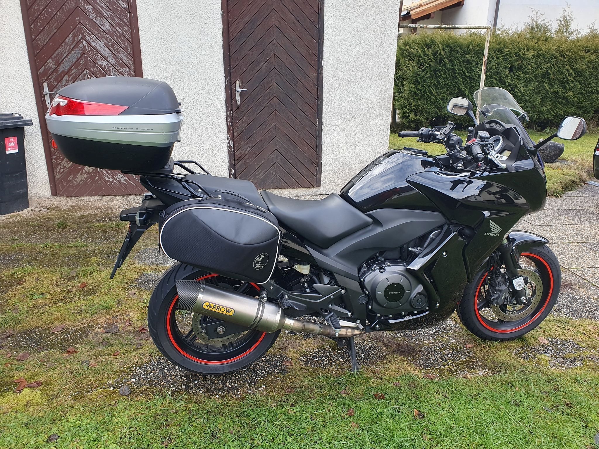 Beim Verkauf mit dabei ist ein Givi-Topcase, Hepco&Becker Seitenkoffer samt Innentaschen sowie ein nagelneues Puig Windschild.