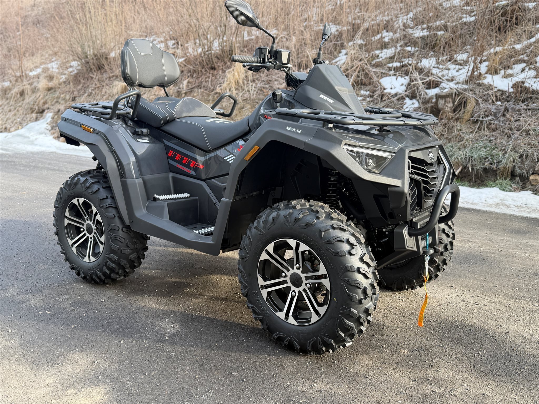 Das elektrische Servolenkungssystem (EPS) sorgt für präzises und ermüdungsfreies Handling, während die Einzelradaufhängung (doppelte Querlenker vorne, geschmiedete Längslenker hinten) höchsten Fahrkomfort garantiert. 27-Zoll-Reifen mit aggressivem Profil, eine Bodenfreiheit von 285 mm und die robuste Bauweise machen das ATV zu einem echten Geländemeister.
