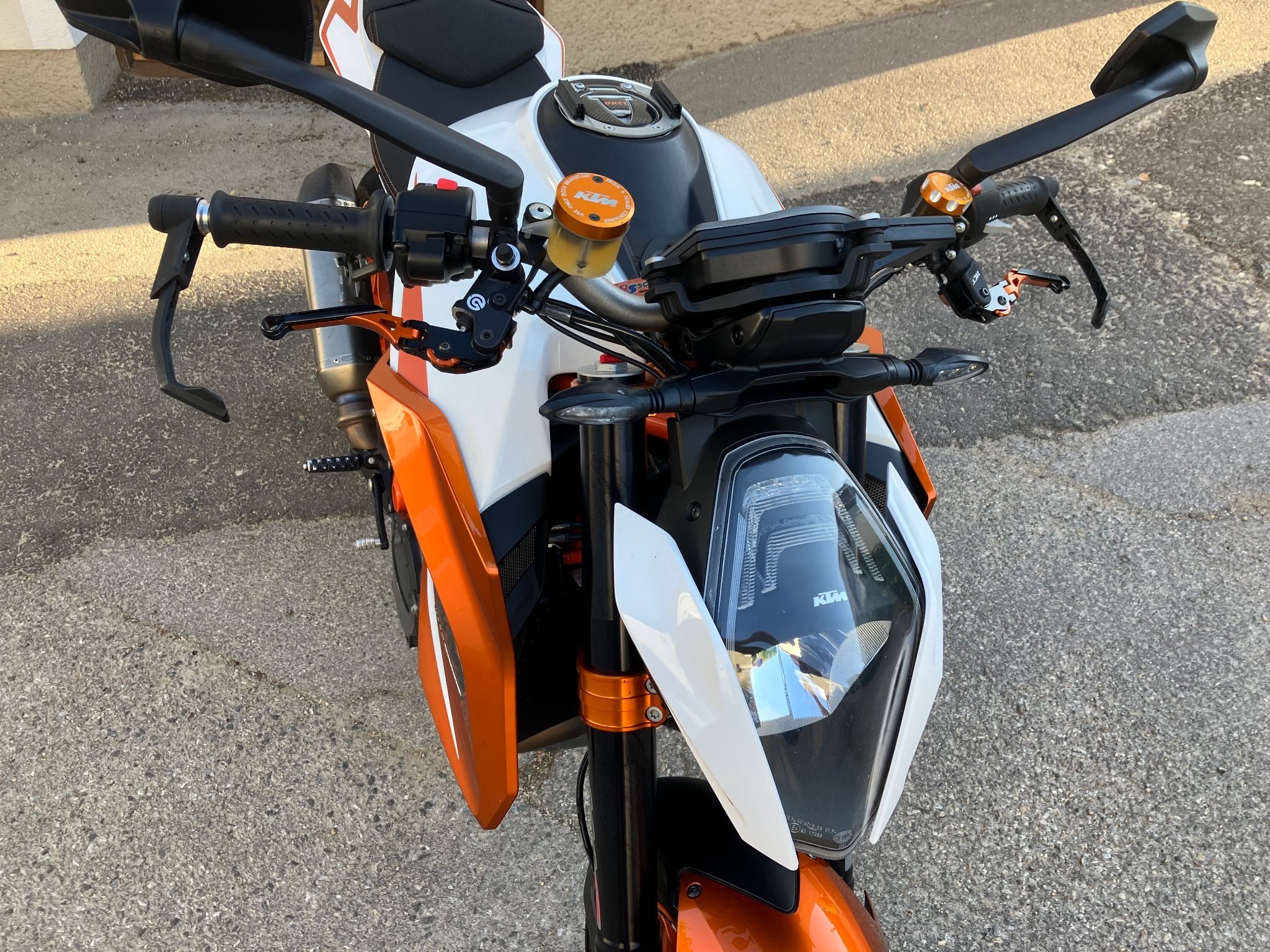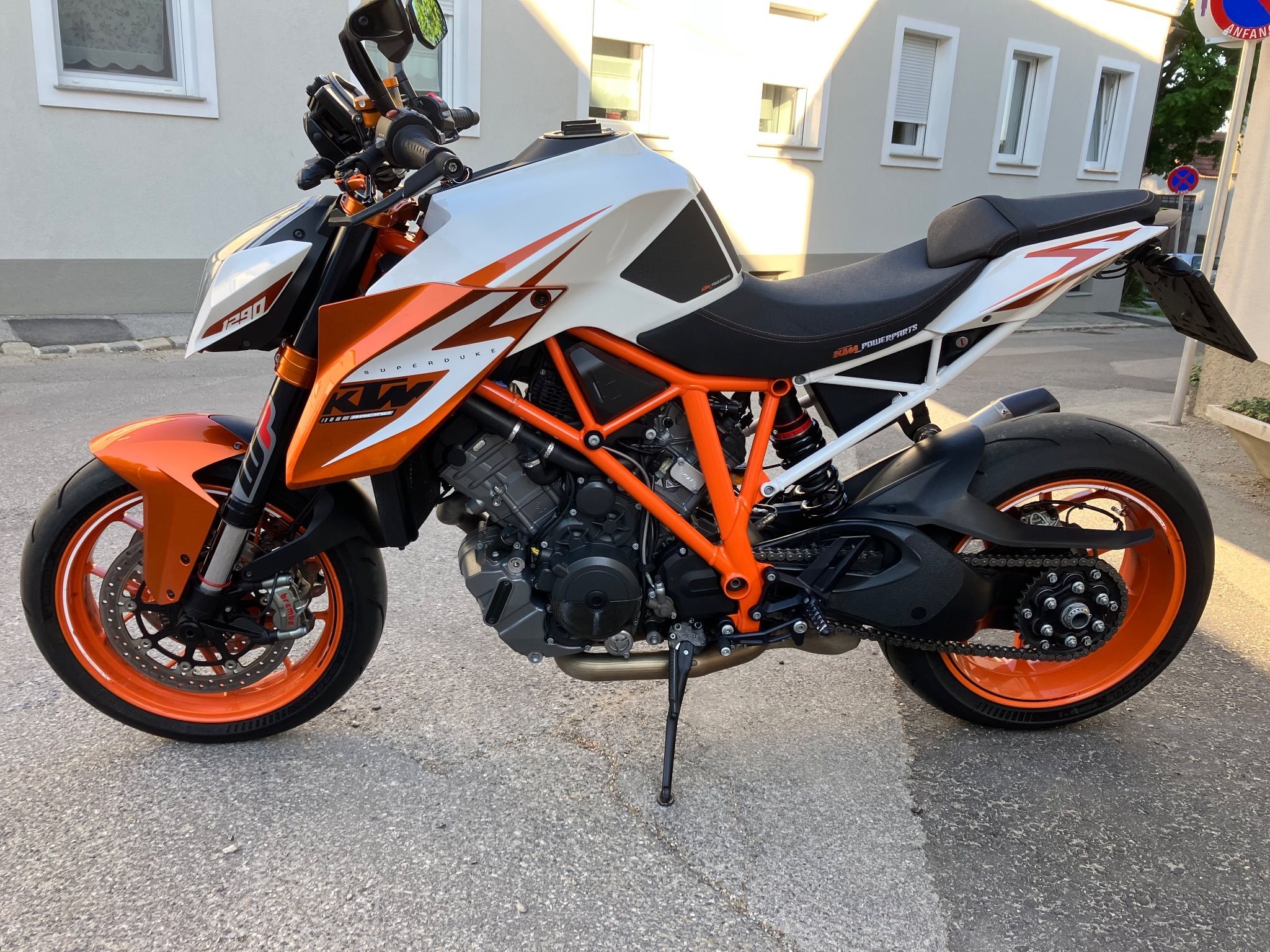 Sondermodell der Super Duke mit sehr vielen Powerparts wie: Race Gabelbrücken orange eloxiert, Brems und Kupplungsprotektor, Motor Carbonschützer Links und rechts, Akrapovic Endtopf, kurzes Heck, Powerpart Sitzbank, Powerparts Hebel und Orange eloxierte Bremsflüssigkeitsdeckel Sonderlackierung weiß mit orange metallic.