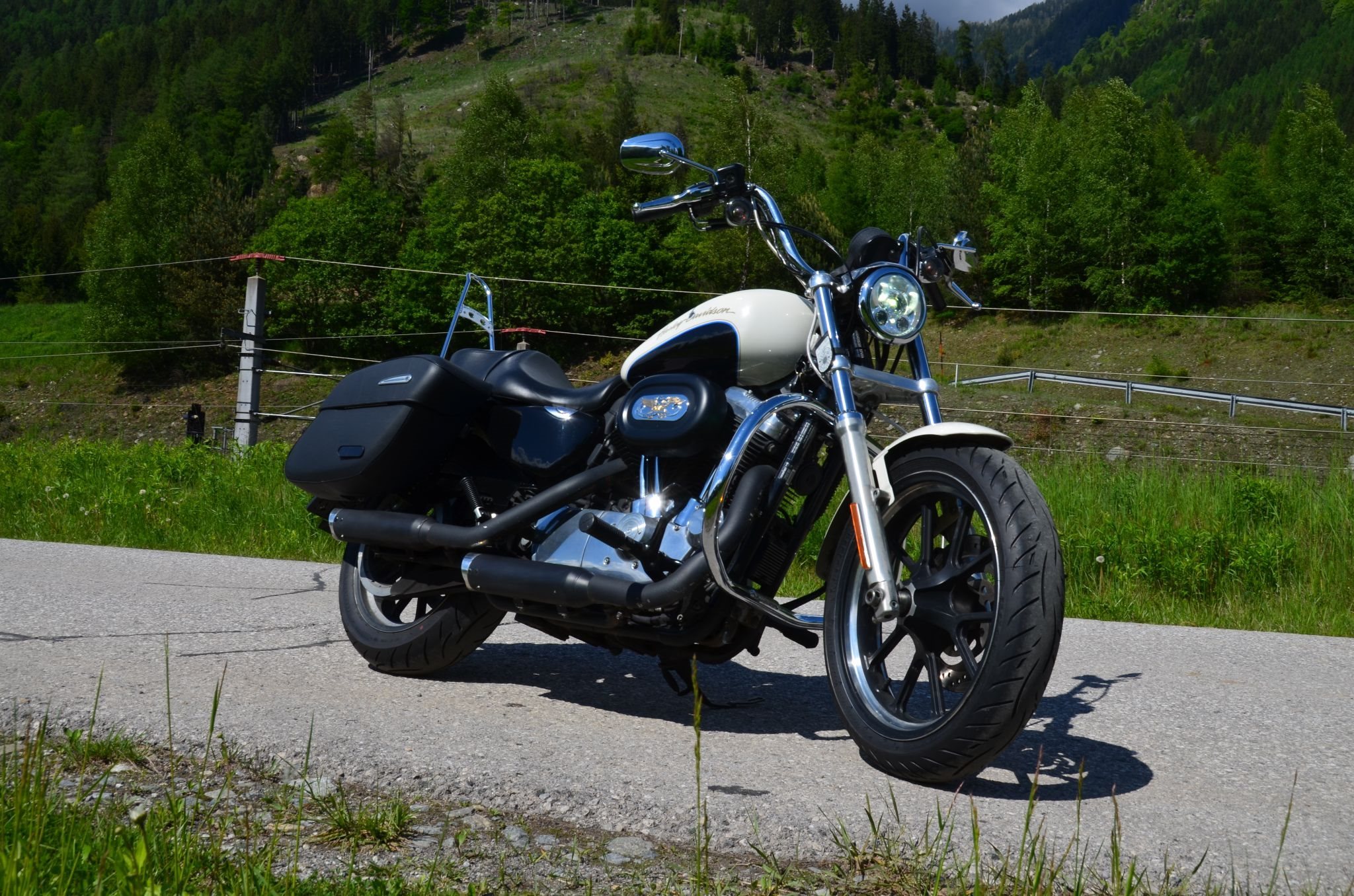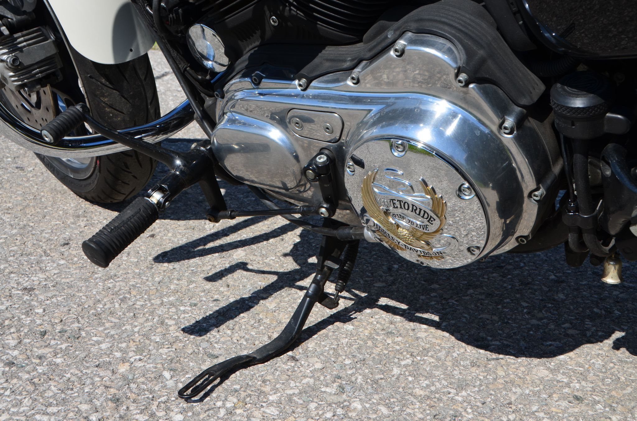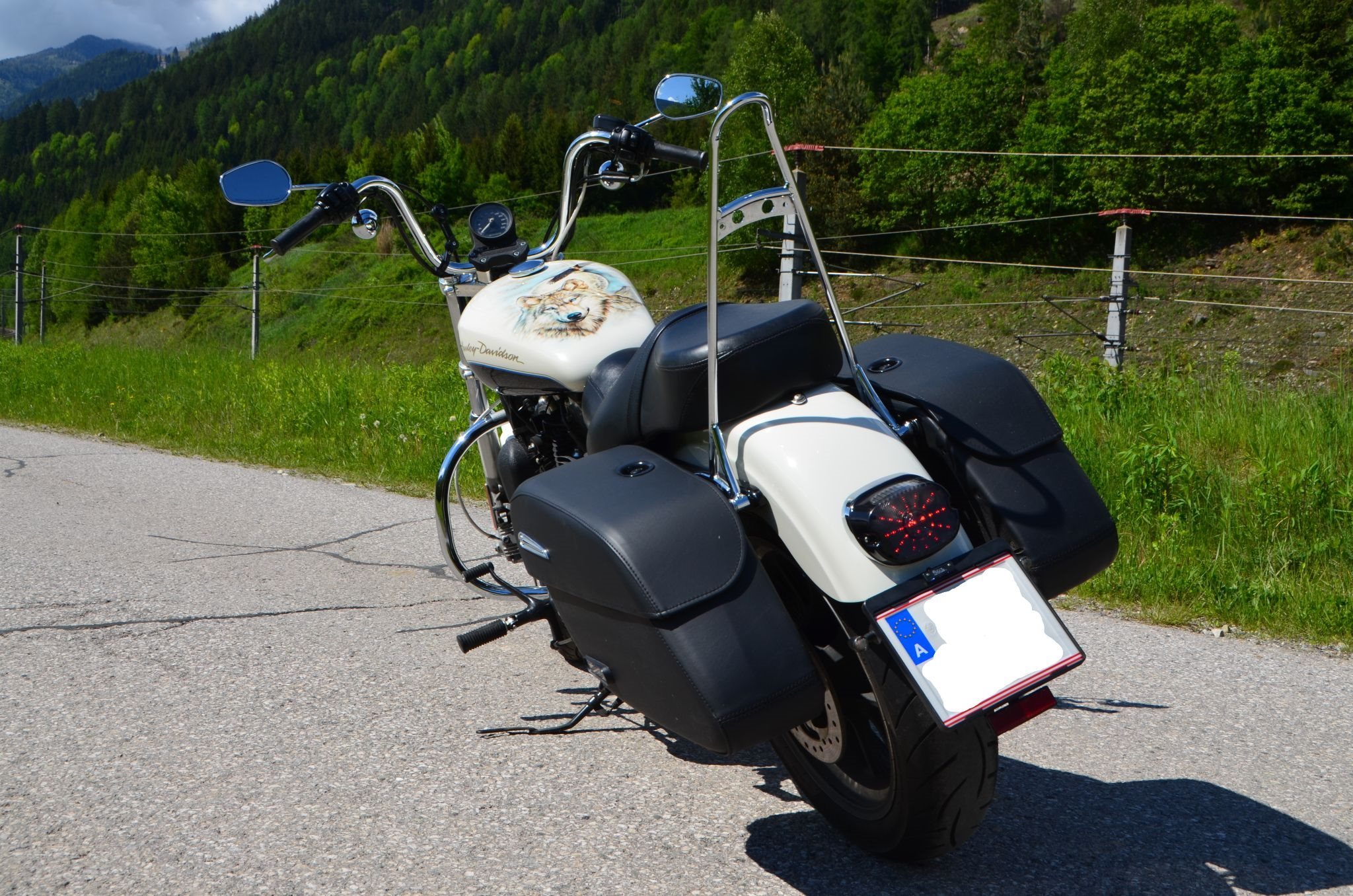 Sturzbügel, vorverlegte Fußraster, Sissybar, Airbrush, Blinker mit Kennzeichenhalterung kombiniert, Auspuffanlage, Reifen, 1-/2-reihige Sitzbank, diverse HD-Applikationen, alles typisiert;