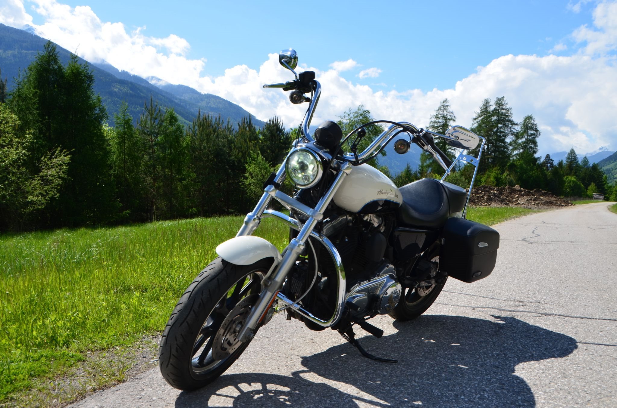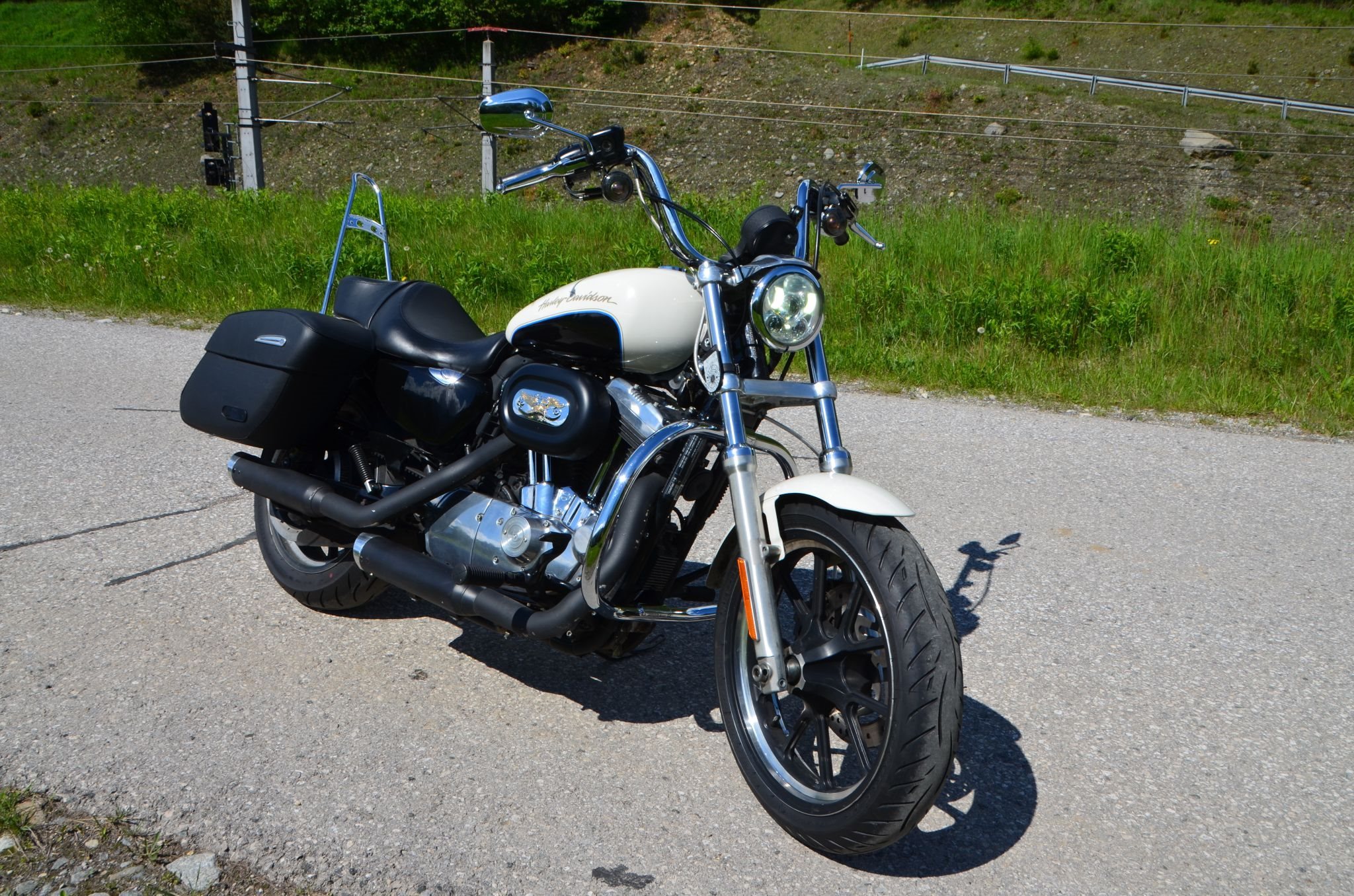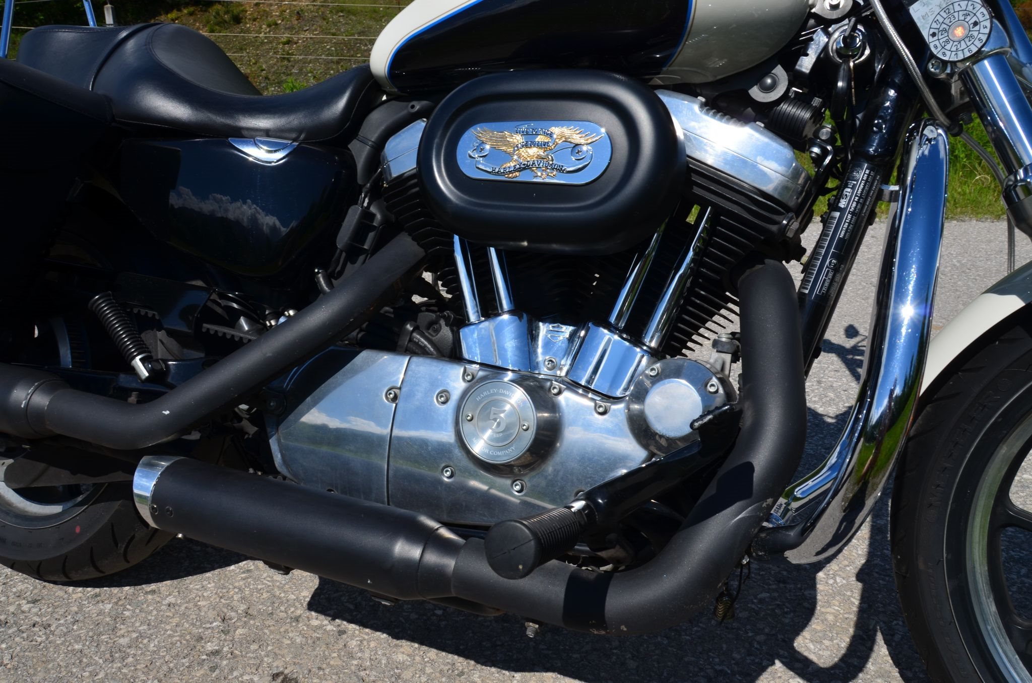 Sturzbügel, vorverlegte Fußraster, Sissybar, Airbrush, Blinker mit Kennzeichenhalterung kombiniert, Auspuffanlage, Reifen, 1-/2-reihige Sitzbank, diverse HD-Applikationen, alles typisiert;