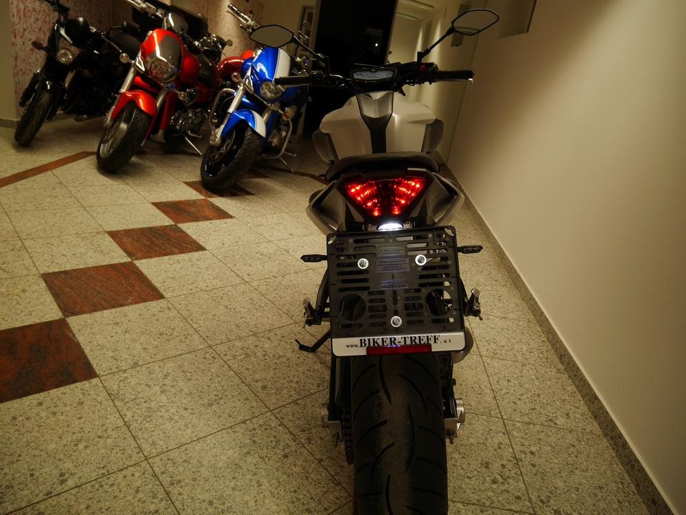 Extras: kurzes Heck mit Rizoma Kennzeichenbeleuchtung, kleine Highsider Blinker mit E-Zeichen, Windschild, Felgenaufkleber und Sturzpats.