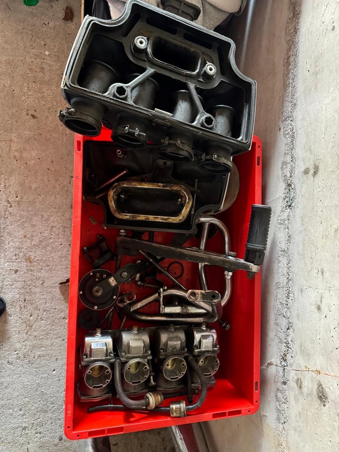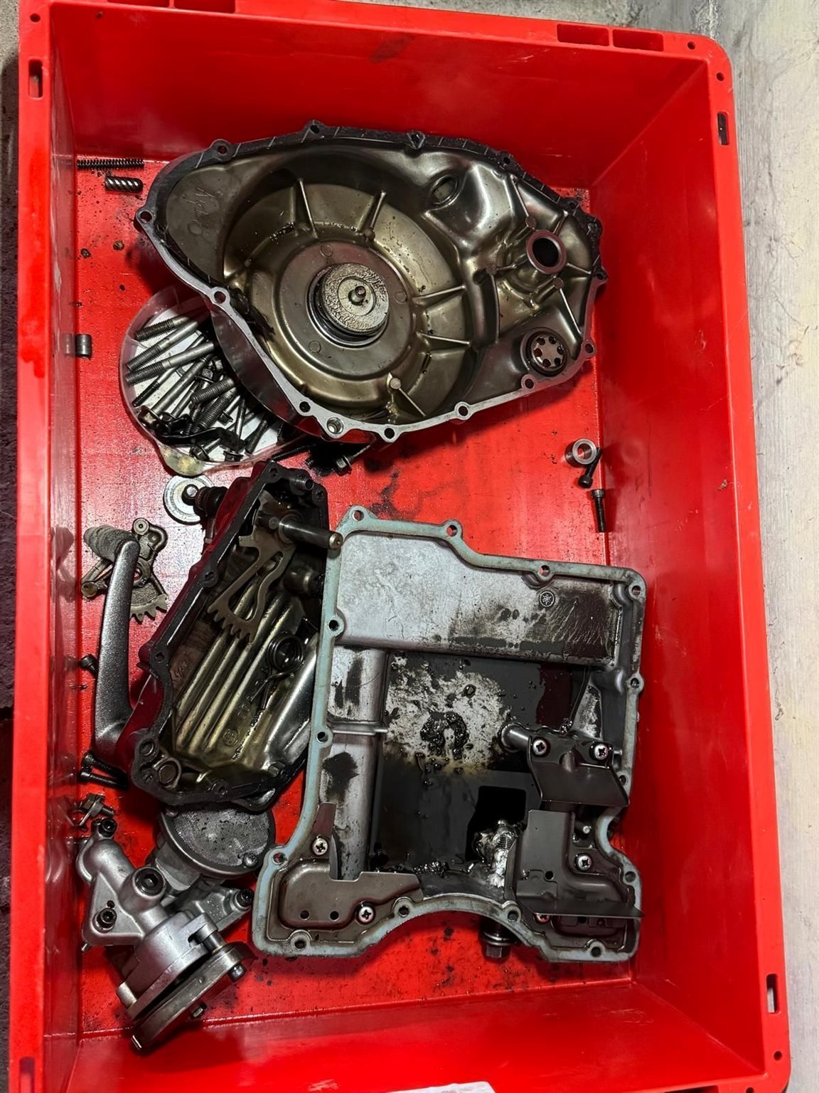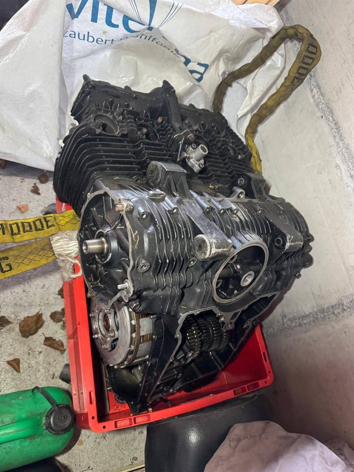 Ist zerlegt aber alle Teile vorhanden und es gibt ein neues Dichtungsset dazu weil auch der Motor offen ist.