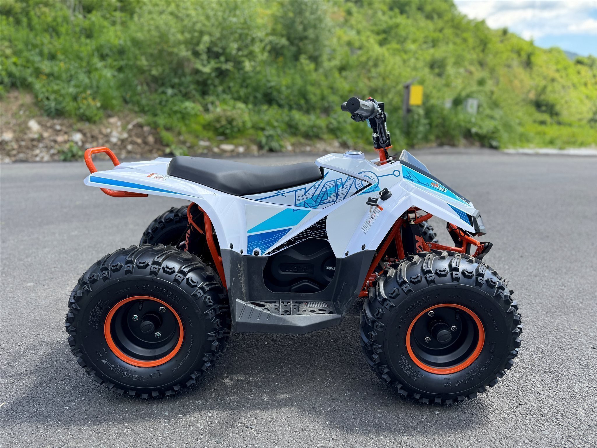 Der EA70 ist das erste elektrische Quad von Kayo! Ausgestattet mit einem bürstenlosen 1400-W-Elektromotor und einer 48-V-20-Ah-Batterie bietet das Kayo-Elektro-Quad für Kinder den besten Kompromiss zwischen Leistung, Autonomie und Fahrspaß, und das alles ohne Lärm und Wartung.