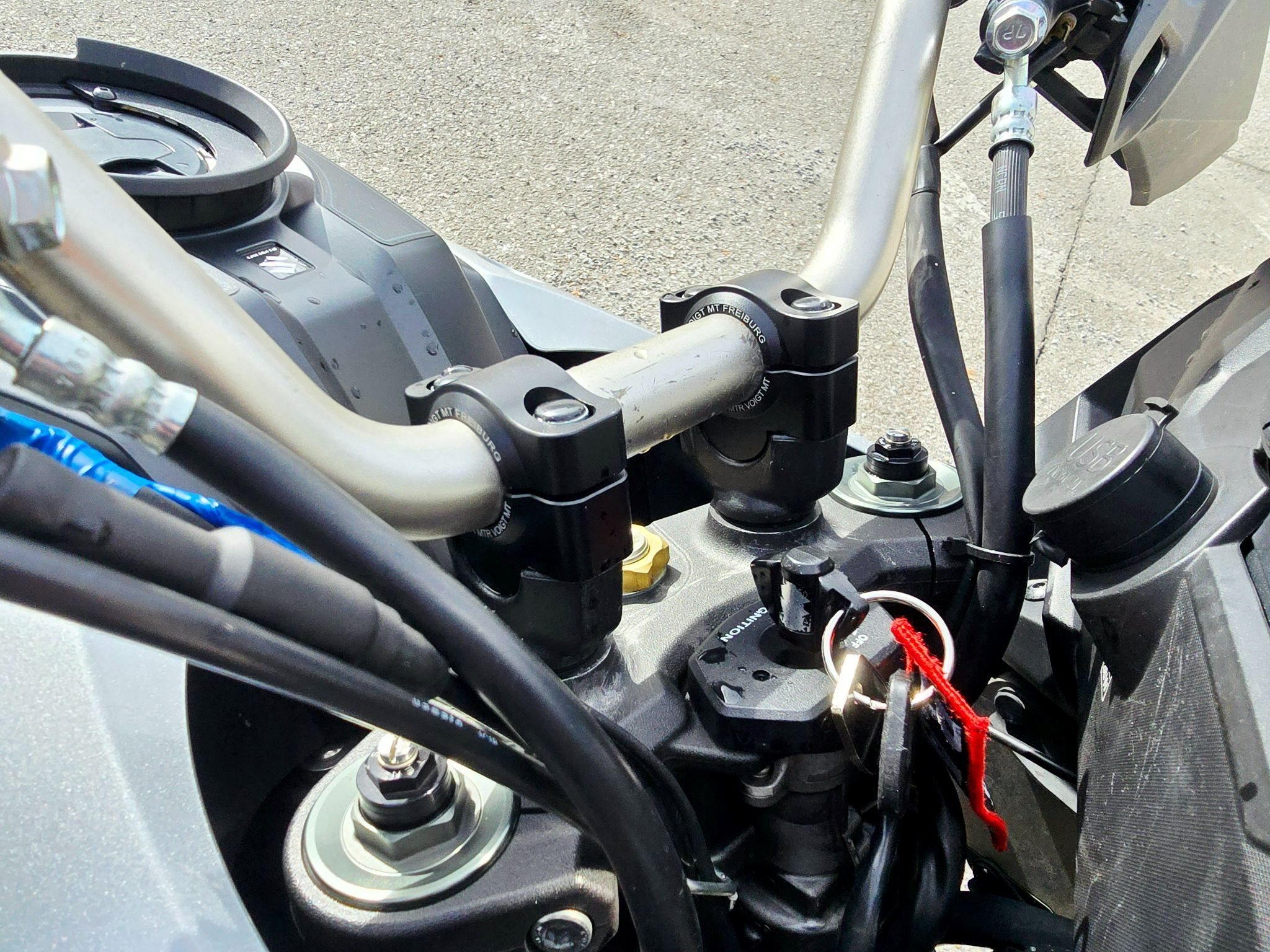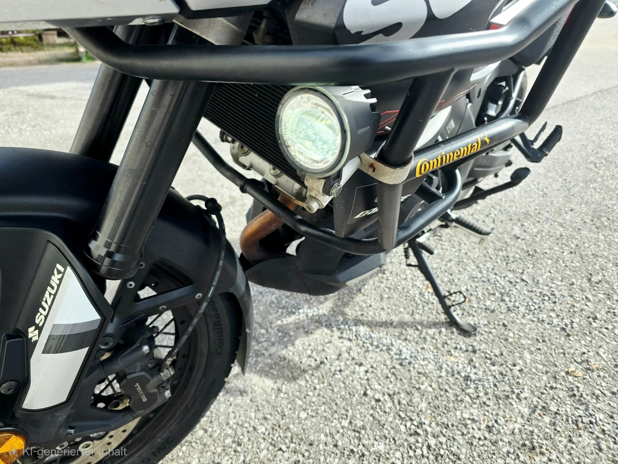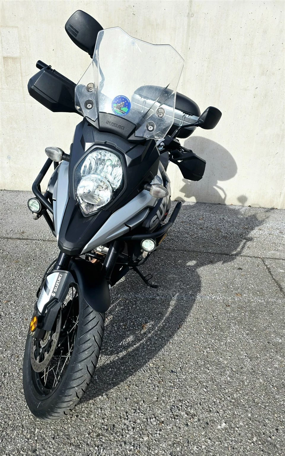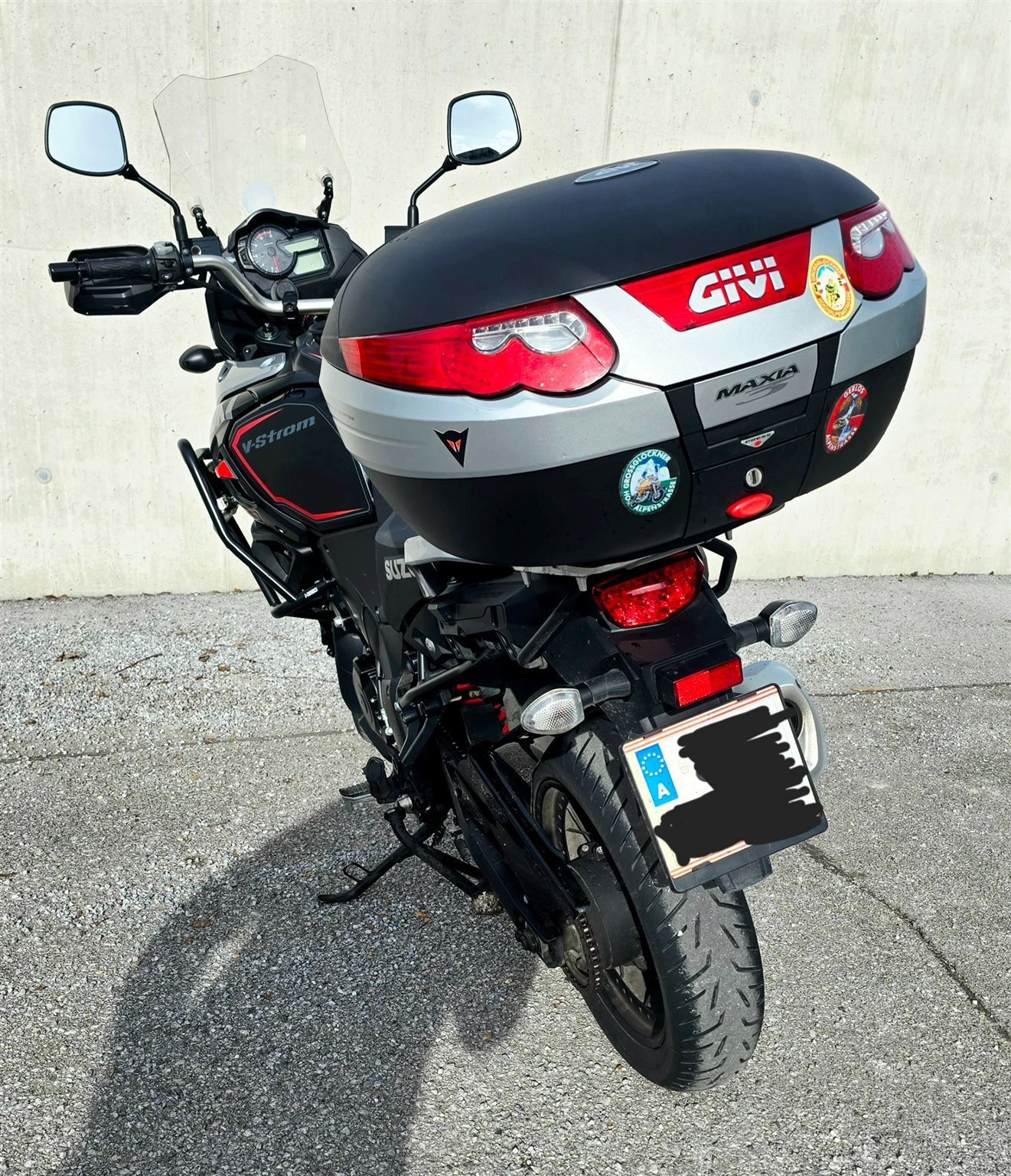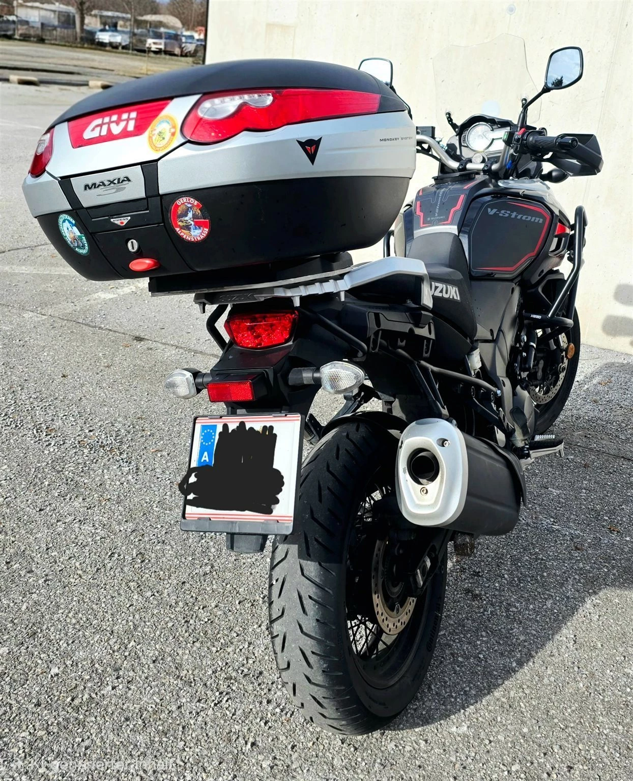 eine Lenkererhöhung, Sturzbügel, Hinterradabdeckung, Hauptständer und Zusatzscheinwerfer sind ebenfalls dabei, sowie das GIVI MAXIA 3 Topcase. Es ist die originale hohe Sitzbank von Suzuki montiert. Die normale Sitzbank gibt es natürlich dazu.