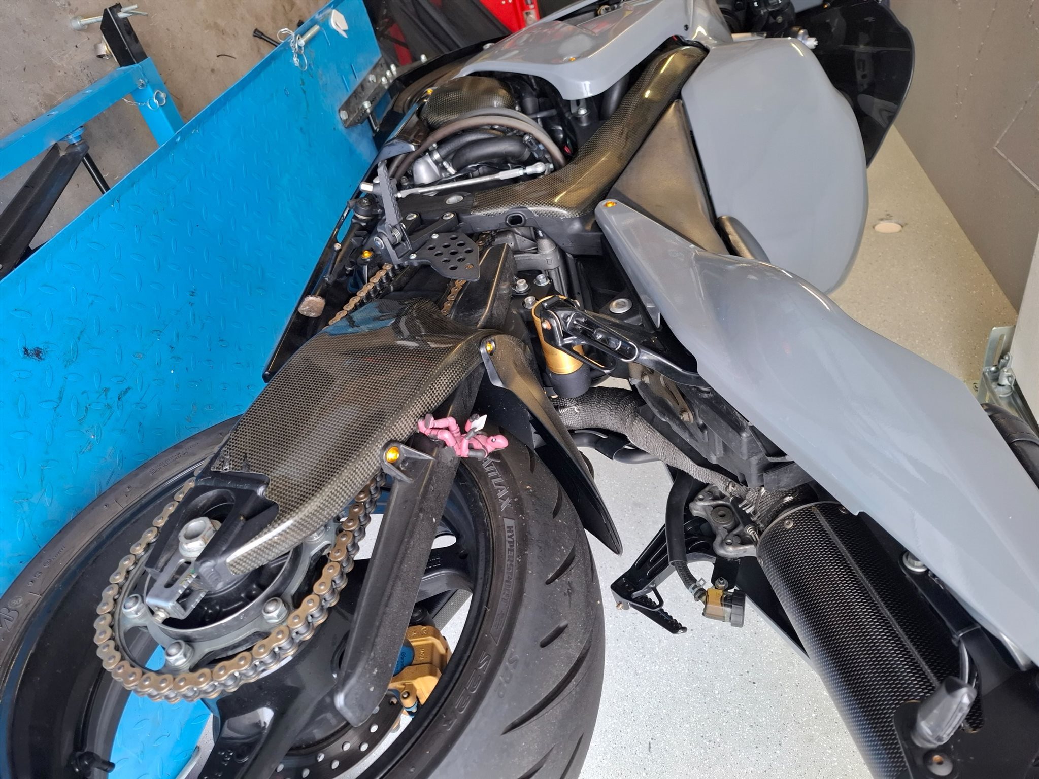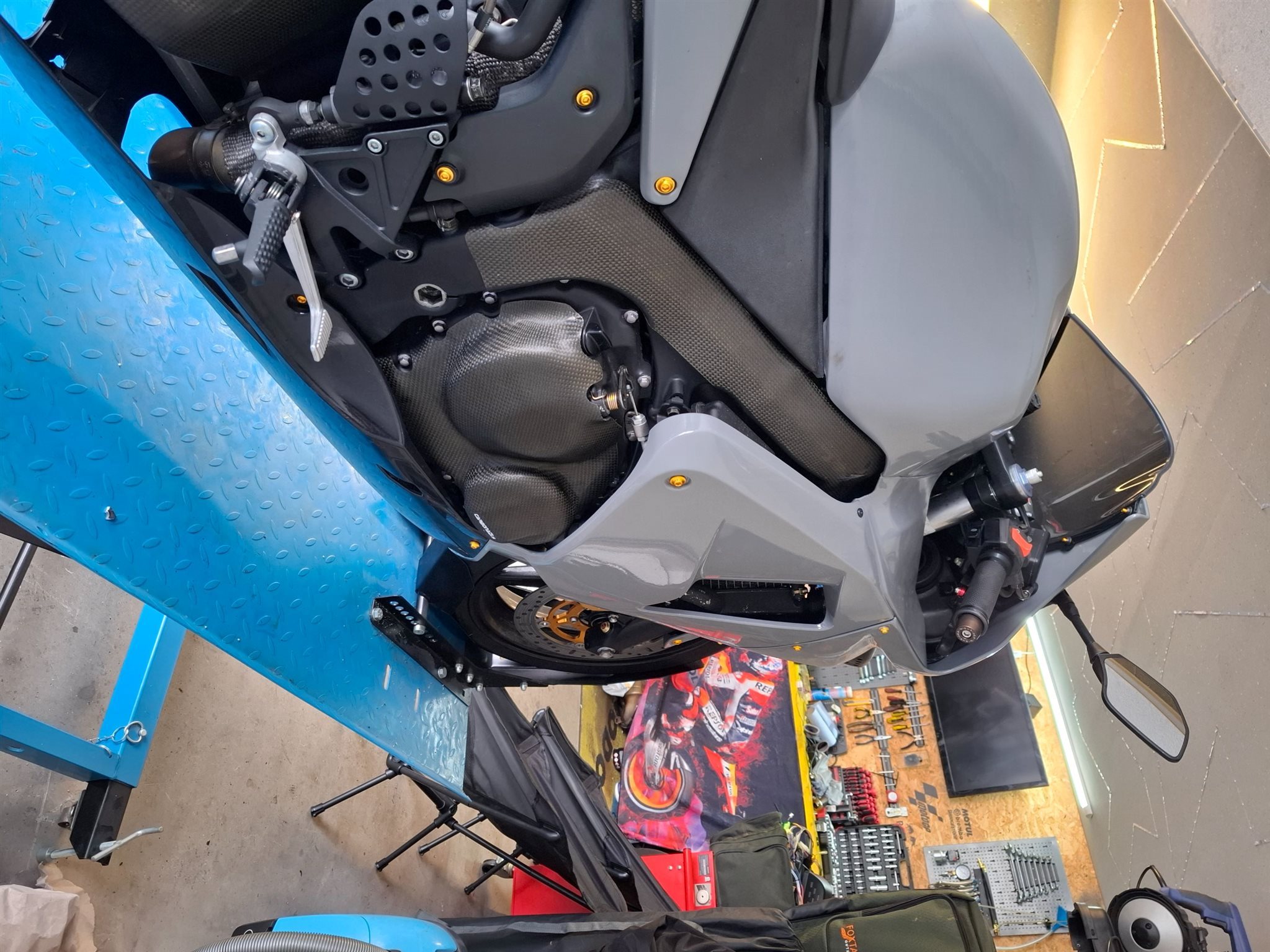 Carbon Rahmenabdeckung, Kupplungs und Lichtmaschinenabdeckung. Stahlflex Bremsleitungen vorne und hinten.