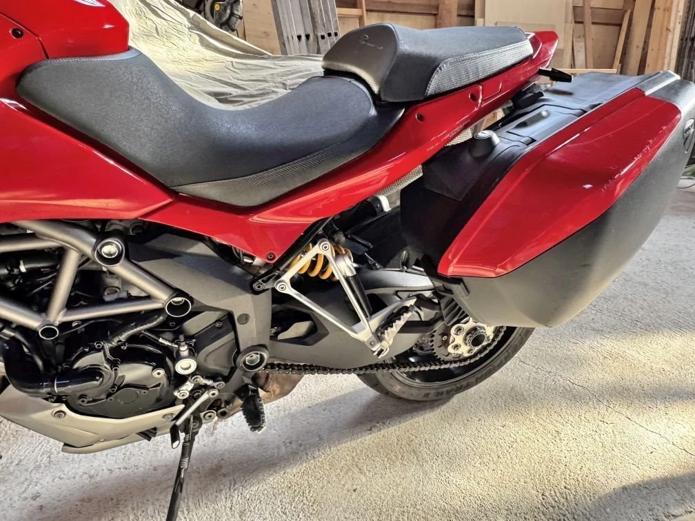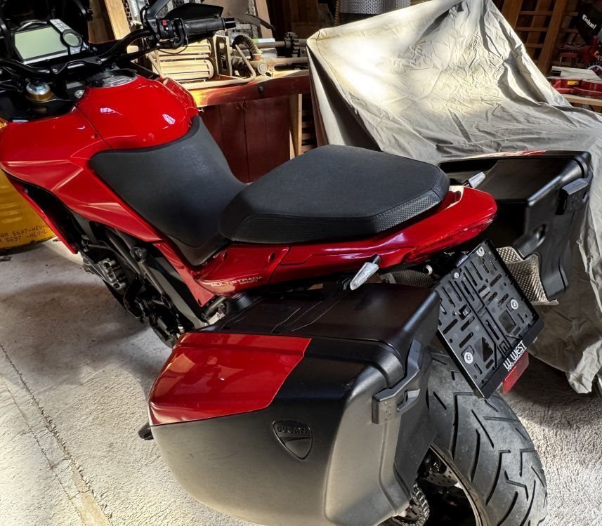 Verkaufe gut erhaltene Ducati 1200 Touring V2, Öhlins-Fahrwerk, Termignoni Endschalldämpfer, kurzes Heck (Rizoma), LED Blinker hinten(Rizoma), 2 seitliche Koffer, Komfortsitzbank, dunkle Scheibe. Bremsbeläge 10 Monate alt, Kette/Ritzel 18 Monate alt. Alle Originalteile werden mitgeliefert(Schalldämpfer, Hauptständer, Original-Heck, Scheibe, Sitzbank).