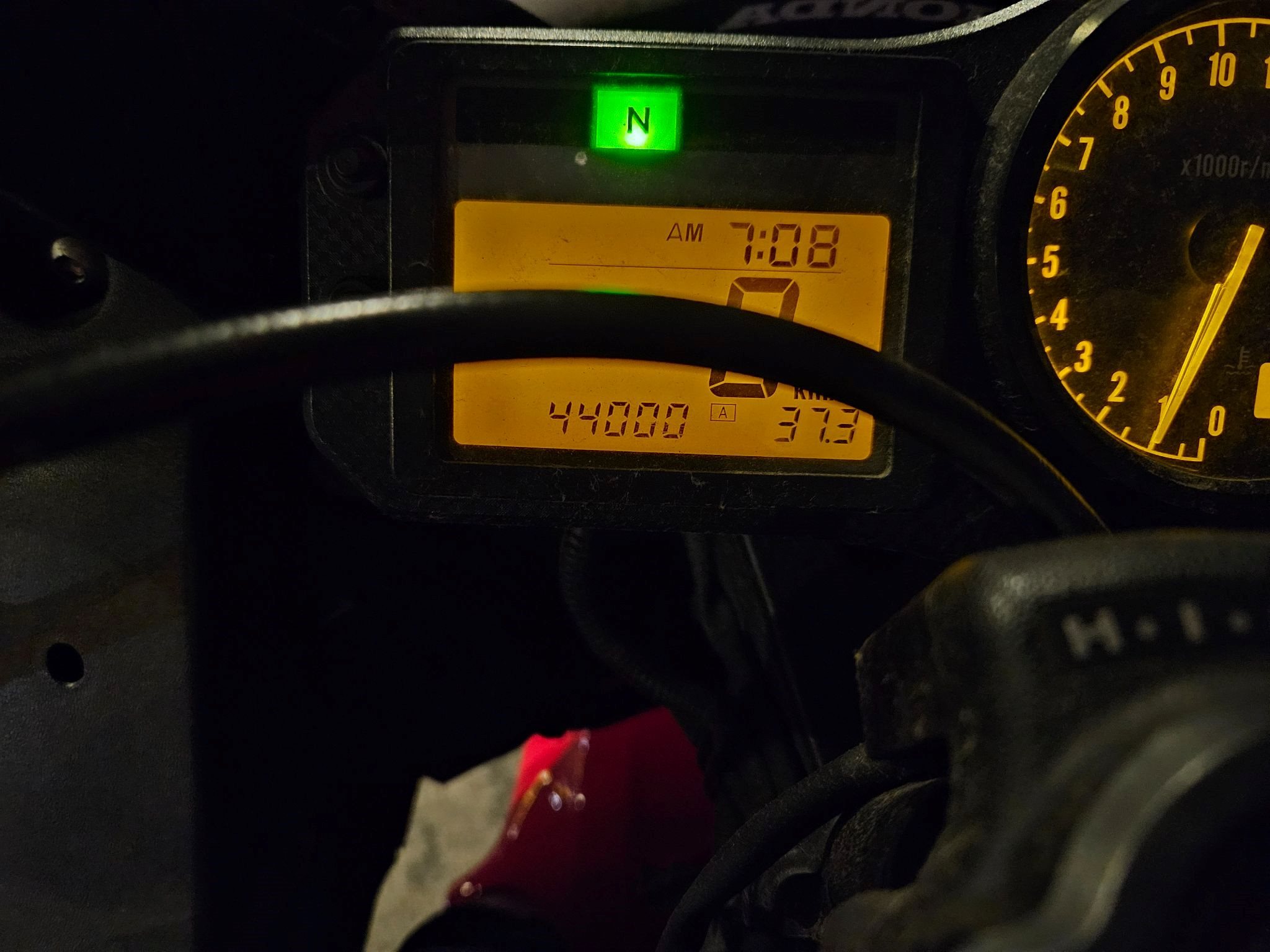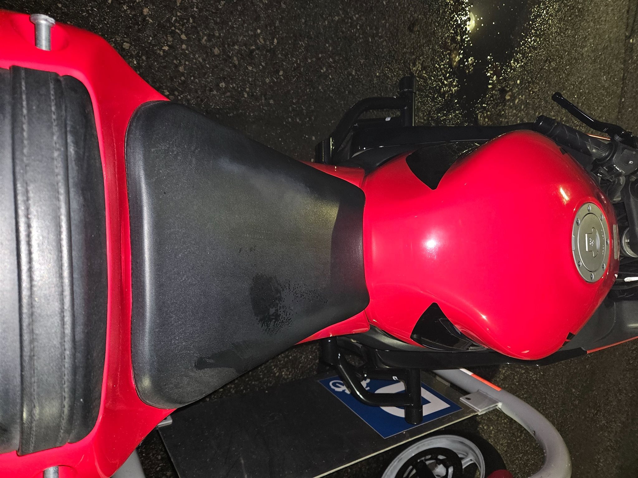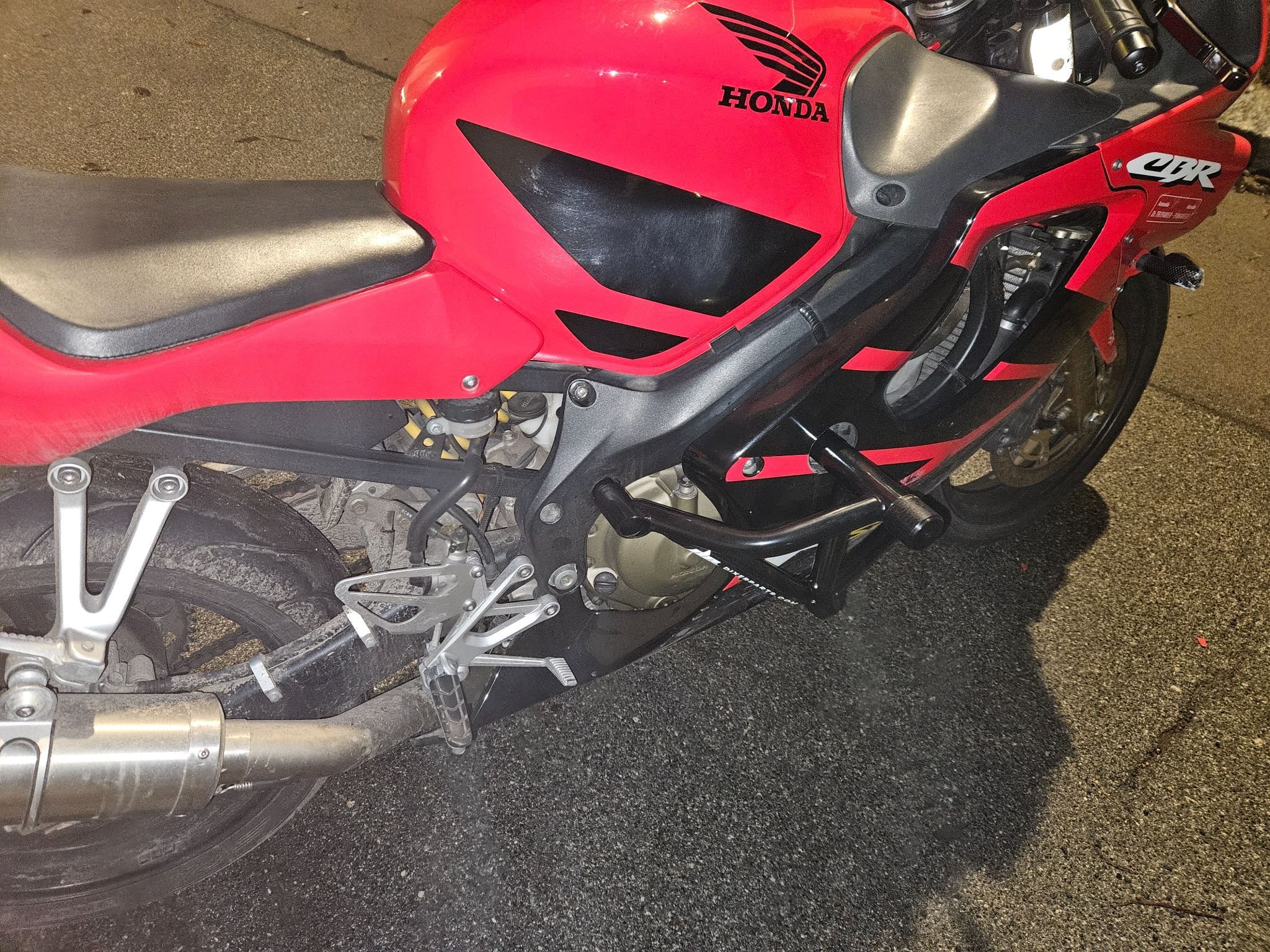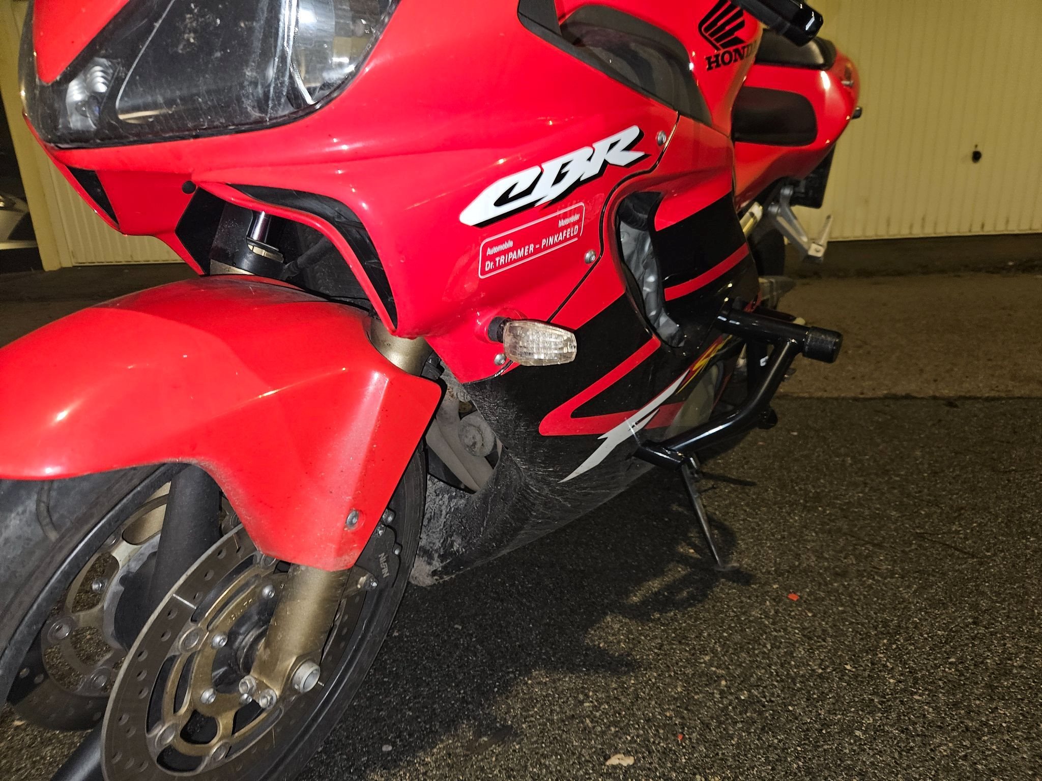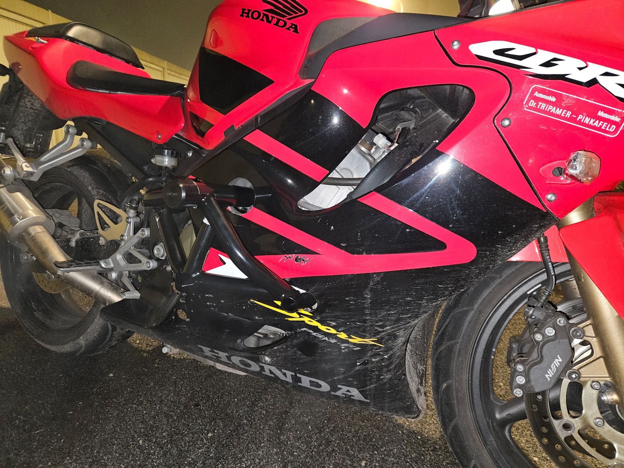 Die Honda ist ehrlich und authentisch. Einmal im Stand auf die rechte Seite gekippt dank Sturzpads und blieb der Rahmen unberührt! Lediglich das Lenkerendgewicht und der Spiegel haben Kratzer (siehe Fotos). Der Bremshebel wurde bereits gegen ein Neuteil getauscht. Ansonsten optisch in einem für das Alter hervorragenden Zustand.