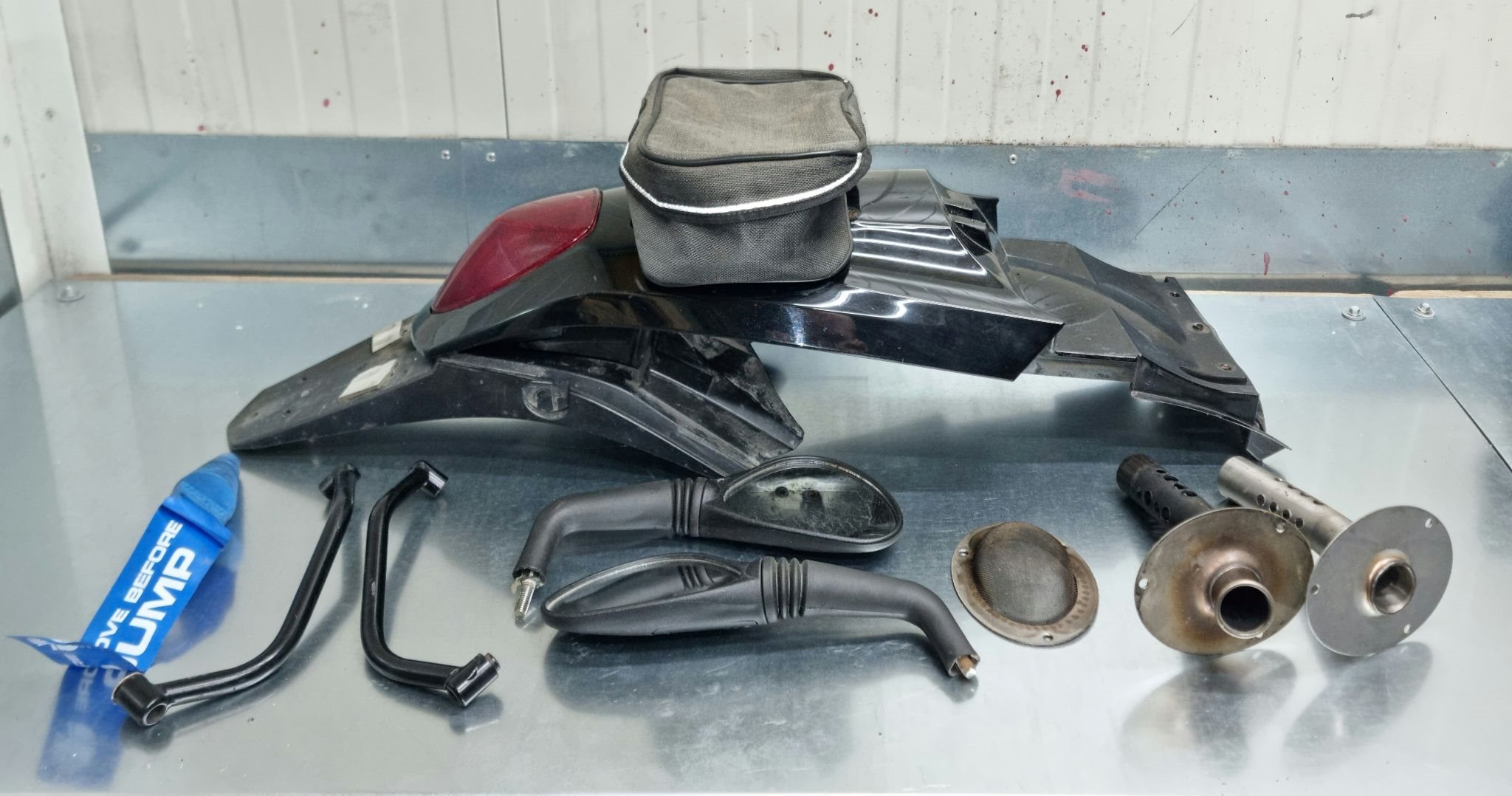 Desweiteren gebe ich noch eine kleine UFO Hecktasche passend zum UFO Heck und einen Auspuffstopfen von LeoVince dazu.