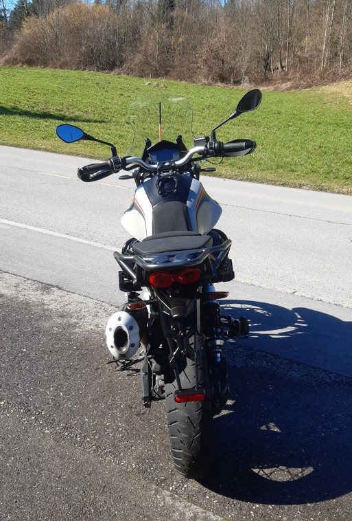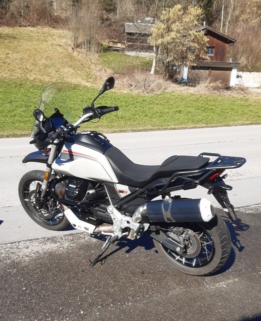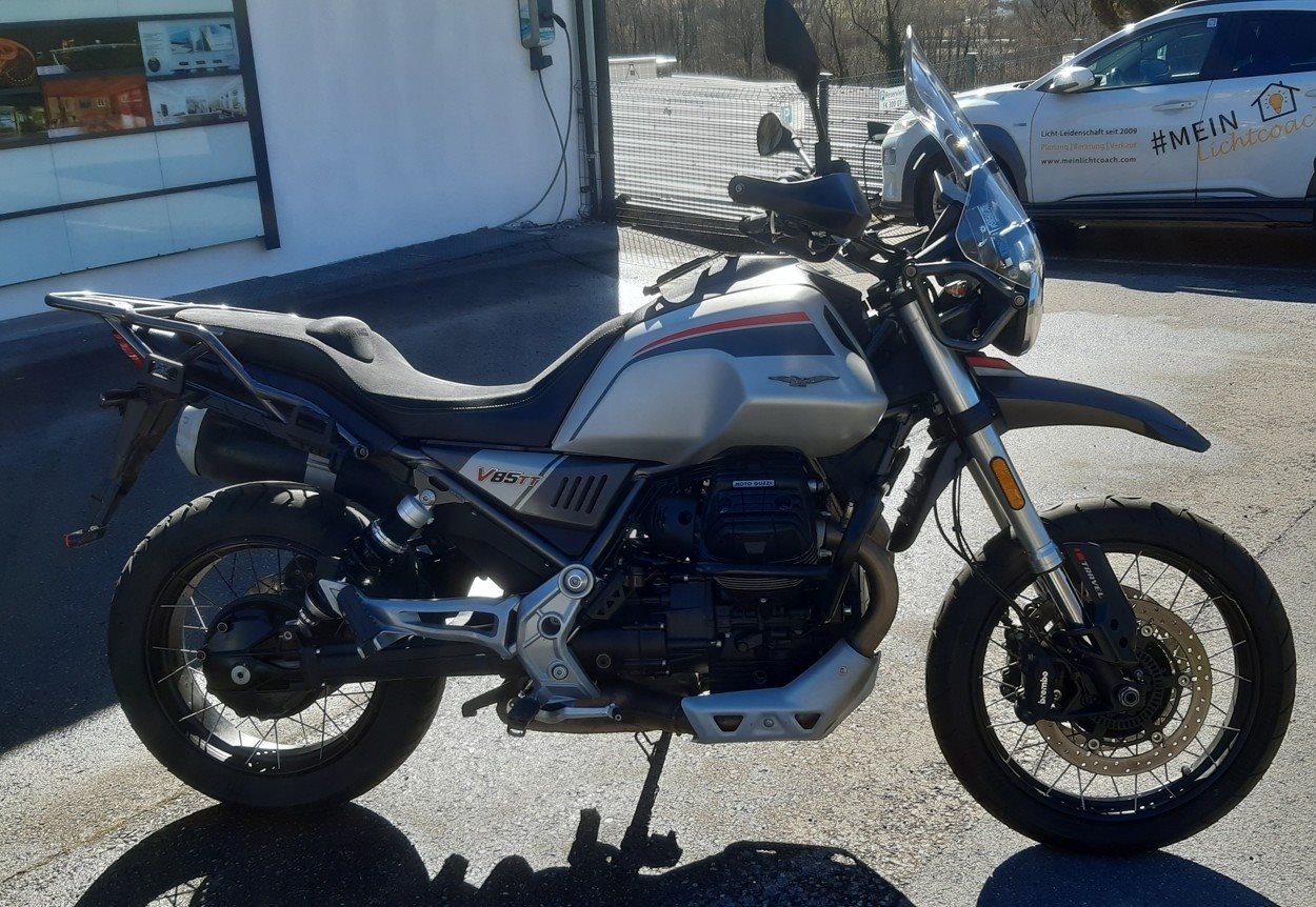 Moto Guzzi V85TT Travel Pack, mit 2 Seitenkoffern mit Innentaschen, ISOTTA Gepäckträger auf Seitenkoffer li + re, Komfortsitzbank, Original und Tiefergelegtes Federbein ( Wilbers = im moment montiert ).