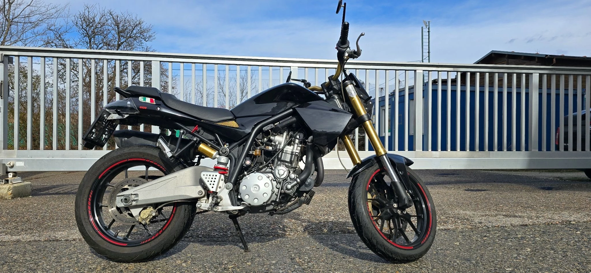 Verkaufe eine absolute Rarität (!) Sammlerstück mit herausragendem Design, wenig gefahrene DERBI Mulhacén 659 in schwarz - Scrambler, mit nur 18.948km (Kilometerstand kann noch geringfügig höher werden als angegeben). Das Aggregat leistet maximal knap 35 kW (gerundet 48 PS) bei 6250/min. Das maximale Drehmoment beträgt 55 Nm bei 5500/min. Fahrfertig wiegt das Motorrad 177 kg. Die Höchstgeschwindigkeit wird mit 165 km/h angegeben. Die Sitzposition auf der 830 mm hohen Sitzbank ist angenehm aufrecht, durch die schlanke Taille erlaubt sie auch kleineren Fahrern stets sicheren Bodenkontakt.