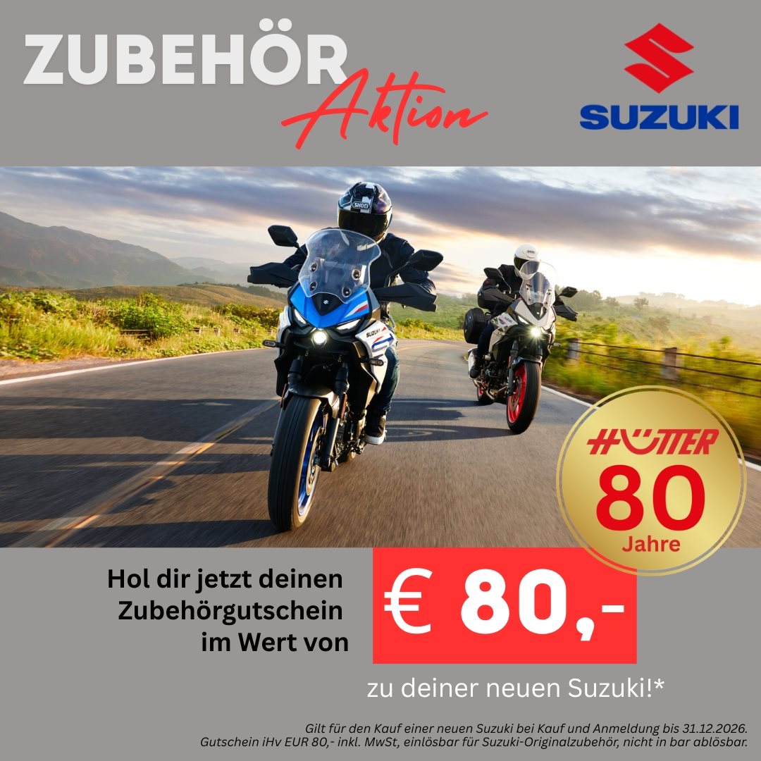 Du erhältst ab dem 01.04. bis zum Jahresende beim Kauf und Anmeldung deiner neuen Suzuki einen € 80,- Zubehörgutschein für Suzuki Originalzubehör dazu.